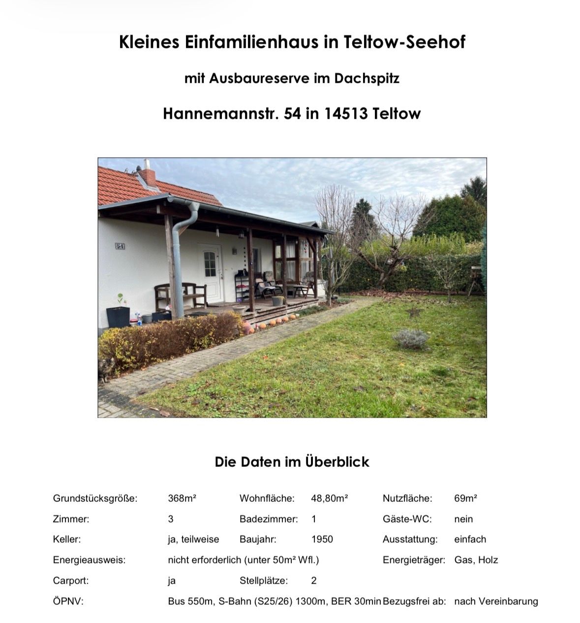 Title: Single-family house in Teltow-Seehof with garden & attic potential – €1,900 all-inclusive Description: Charming small single-family house for rent in a quiet location in Teltow-Seehof. The house offers approx. 49 m² of living space with 3 rooms, kitchen, and bathroom, plus additional expansion potential in the attic.  The property sits on a plot of approx. 368 m² and features a nice garden, a covered terrace, as well as a carport and parking spaces.  The house is partially basement...