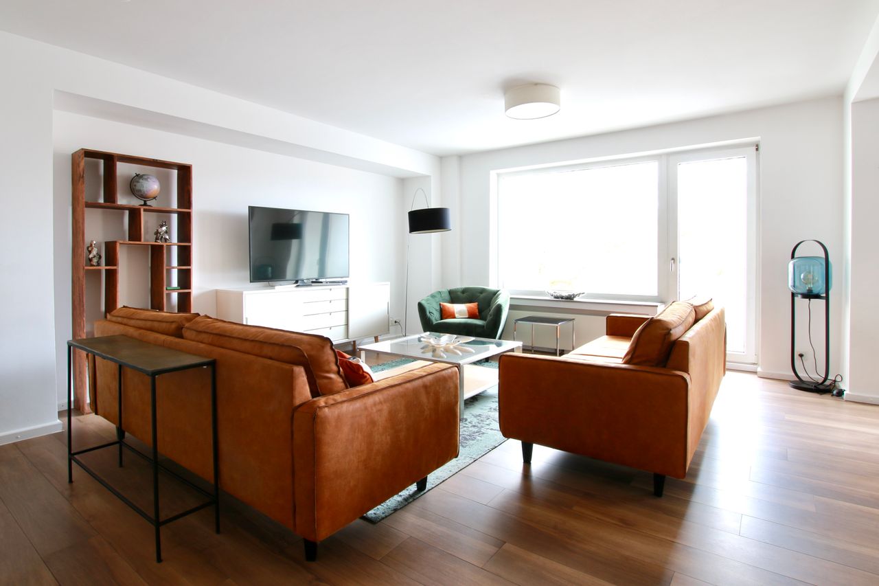 101 sqm apartment with 2 bedrooms and balcony in a quiet location on the border of the Belgian Quarter. The 2 bedrooms each have a box spring bed (180 cm width) and a wardrobe – the larger bedroom also has a desk, while the smaller bedroom has an armchair and TV. The large, open-plan living room has a spacious seating area with two sofas, a TV, a large dining table, and a fully equipped kitchen with a refrigerator, hob, oven, dishwasher, kettle, toaster, and coffee machine. The large bathroom ha...