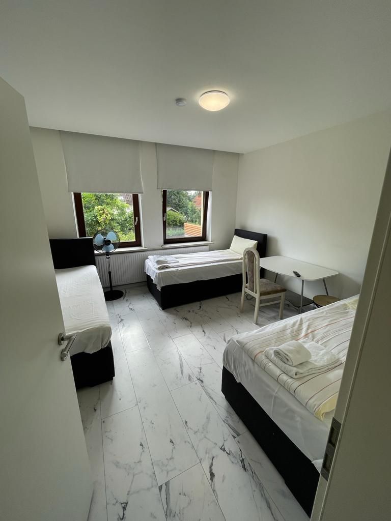This large apartment features four separate bedrooms, each with comfortable beds and a private TV. The bright kitchen under the sloped ceiling is fully equipped and includes a cozy dining area. Two modern bathrooms offer convenience, including a washing machine and dryer. Ideal for workers or groups looking for a comfortable stay.