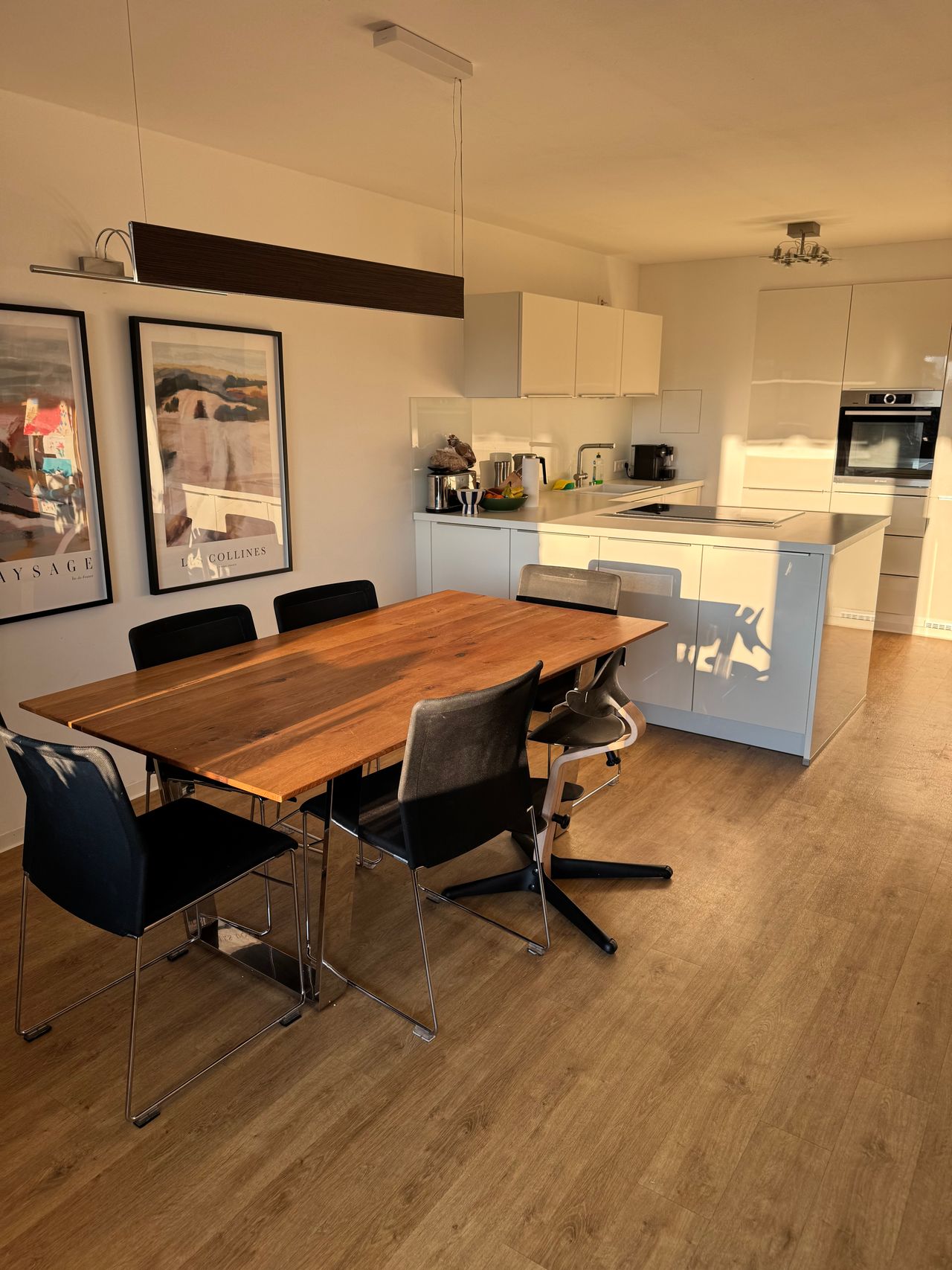 This bright and spacious apartment offers approximately 90 m² of living space with 3.5 rooms and a new bathroom. The open-plan kitchen and living area provides a perfect space for cooking and socializing. Features & Amenities: • Fully furnished: sofa, dining table, cupboards, bed, kitchen appliances • Open-plan kitchen with modern fittings • New bathroom with shower and washing machine • Door intercom system • High-speed Wi-Fi Parking: • Underground parking space included • Additional p...