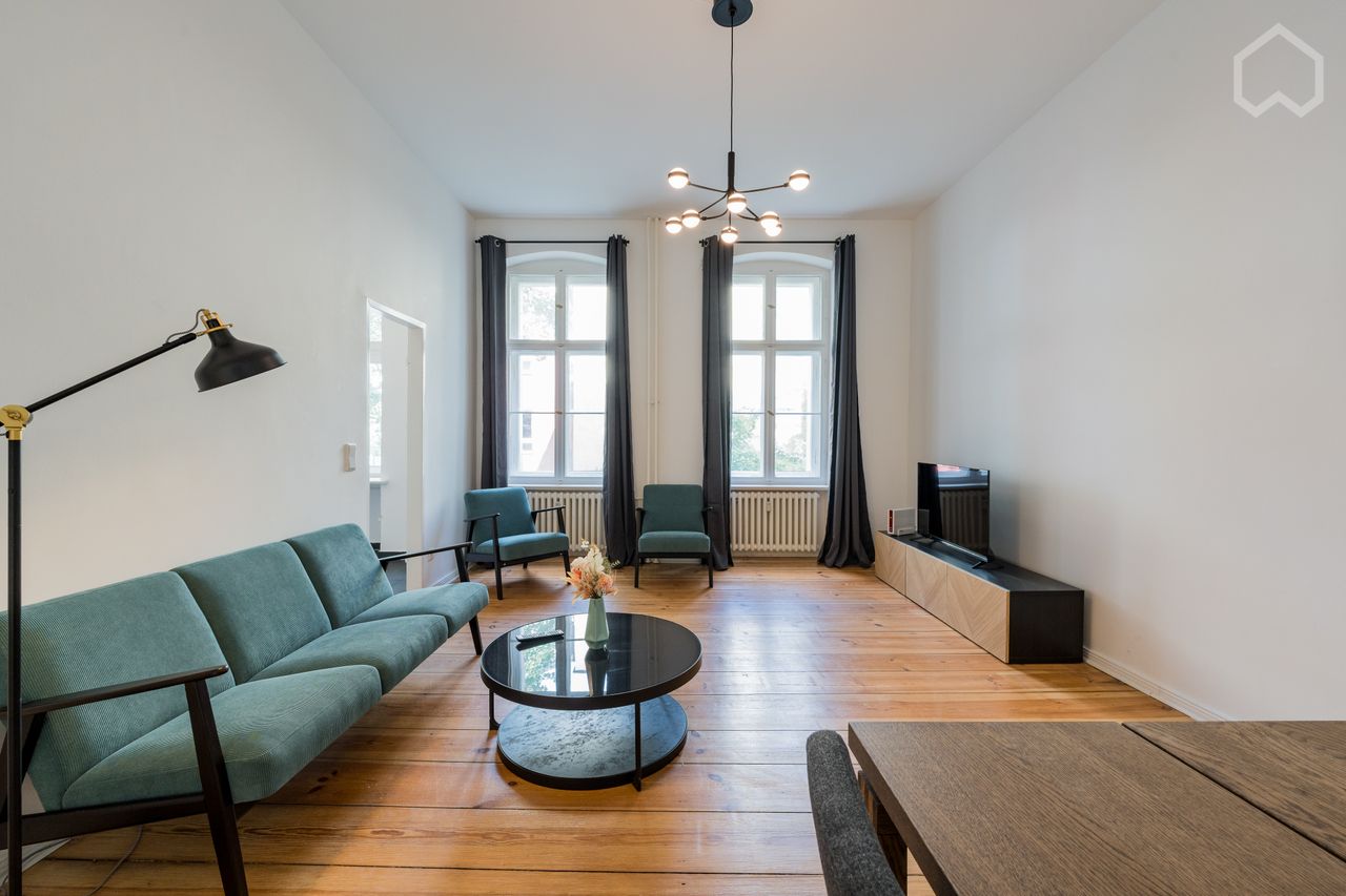 This beautiful apartment is located on the second floor of the back house and is therefore very quiet. The apartment is equipped with a beautiful old plank floor. To the left of the front door, the hallway leads to the two bedrooms, both equipped with a double bed and a large wardrobe. In one bedroom there is also a corner desk. To the right of the hallway is the bathroom, living room and kitchen. The S-Bahn station Julius Leber Brücke is a few minutes walk away, so that the lines S1, bus 106, 2...