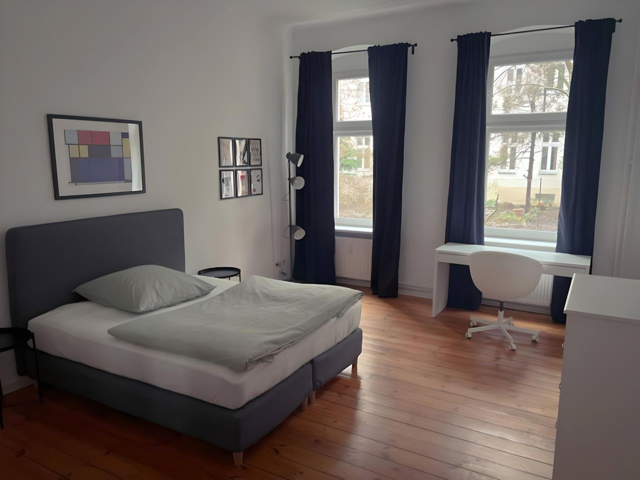 Please keep in mind that the 480€ cleaning fee + 480€ non-deposit fee have to be paid BEFORE moving in. This is an unlimited contract with 1 month notice. This is one of the 4 bedrooms in the apartment. YOUR ROOM: The room is particularly bright. The room is equipped with a king-sized box-spring bed with fine bedding as well as two bedside tables, a chest of drawers, a large mirror, a working desk with a corresponding chair, a floor lamp and a large closet. In addition to your own room, you an...