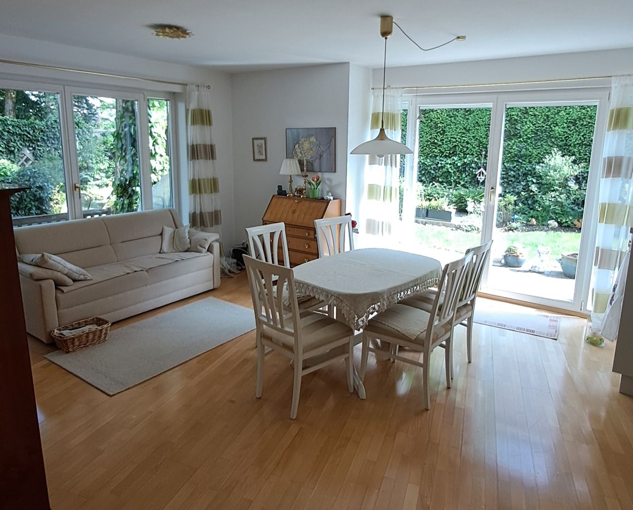 Drei-Zimmer-Gartenwohnung in Pasing-Obermenzing, ruhig und schön, TG-Platz, 2 Minuten zu Fuß zum Bus, ca. 10 Minuten zu Fuß zur S-Bahn. Stilvolle Einrichtung, Fußbodenheizung, Dusche/Badewanne, 2 Terrassen (Sonne und Schatten) und Gartenanteil.