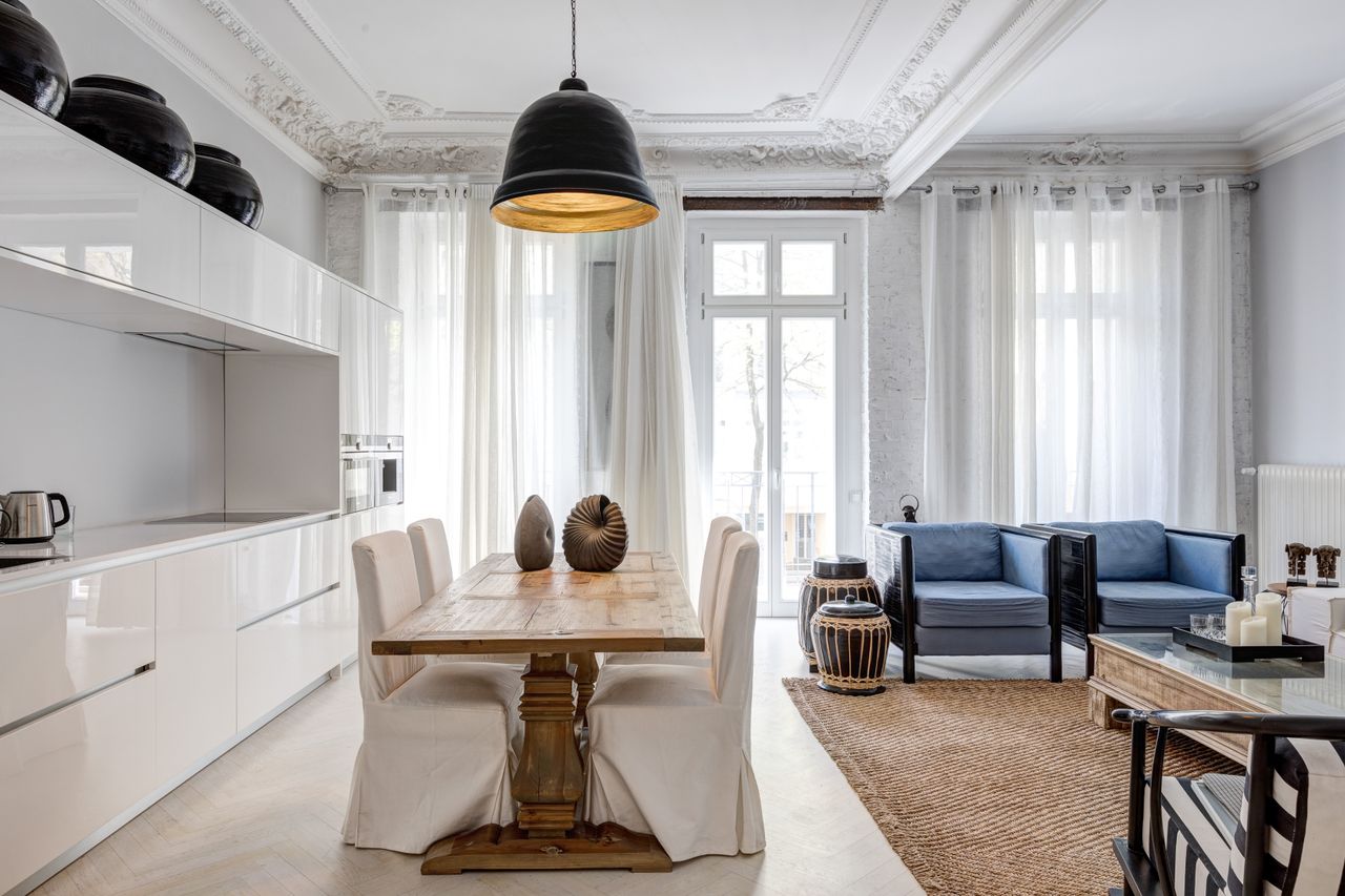 129 m² of pure luxury with high stucco ceilings, parquet floors, exquisite furniture, state-of-the-art kitchen, 3 bathrooms and huge balconies. Floor of a well-kept residential complex 100 m from the pedestrian zone and shopping promenade Wilmersdorfer Str in a quiet side street Floor-to-ceiling balcony windows overlook the 6 m long main balcony. Living room with large seating area and dining table, flat screen TV, numerous works of art and fully equipped, modern kitchen (including a full co...