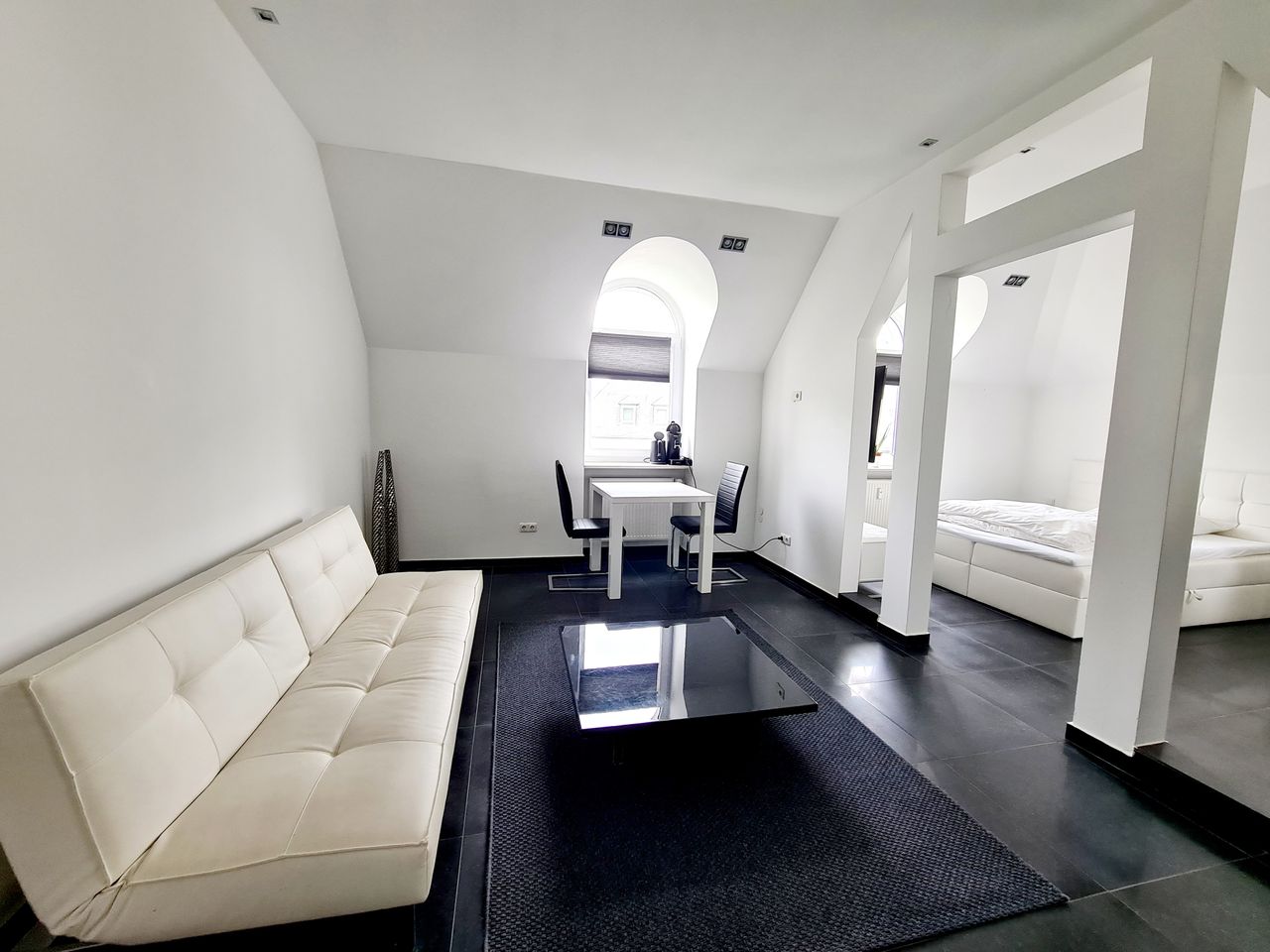 The apartment is located in a small villa one minute walk to the beautiful Kurpark in Wiesbaden. The apartment is furnished and can be moved into immediately. The apartment has been completely and extensively renovated. Last year all windows were also replaced. The apartment is very bright and also has various light and halogen chandeliers on walls and ceilings. The floor is covered with fine black stone tiles and the bathroom is kept in light beige. The apartment is fully furnished and equipp...