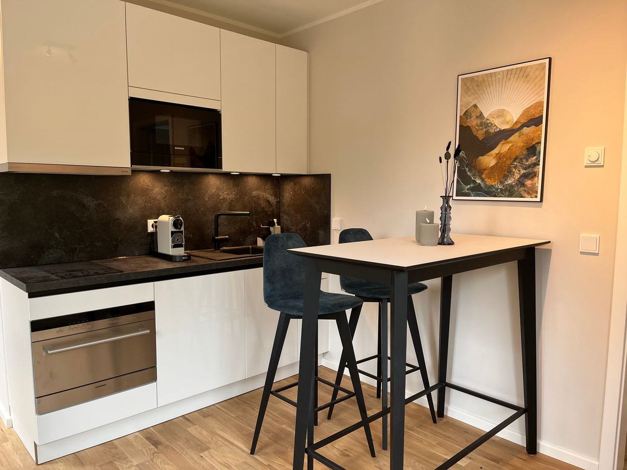 Welcome to your elegant home away from home – a beautifully furnished apartment on the 2nd floor of a modern building, located right next to the UNESCO-listed Sanssouci Palace Park in Potsdam. Enjoy peaceful surroundings, tasteful design, and modern comfort in one of the city’s most sought-after locations. The apartment features a separate bedroom with a high-quality box-spring bed, large windows, and direct access to a private balcony – perfect for a restful night’s sleep and tranquil mornings...
