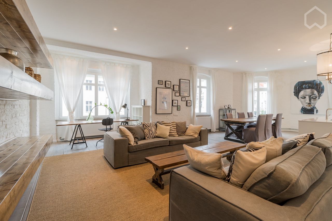 Luxuriöse 3,5-Zimmer-Wohnung im Herzen von Friedrichshain Diese exklusive 3,5-Zimmer-Wohnung befindet sich im 3. Obergeschoss eines gepflegten Wohnkomplexes mit Aufzug – mitten im lebendigen Berliner Stadtteil Friedrichshain. In unmittelbarer Nähe finden Sie angesagte Restaurants, Bars und Wochenmärkte. Mit einer Wohnfläche von ca. 138 m² bietet diese lichtdurchflutete Wohnung ein außergewöhnliches Wohnambiente. Sie wurde von einem Designer eingerichtet und ist vollständig mit hochwertigem Mob...