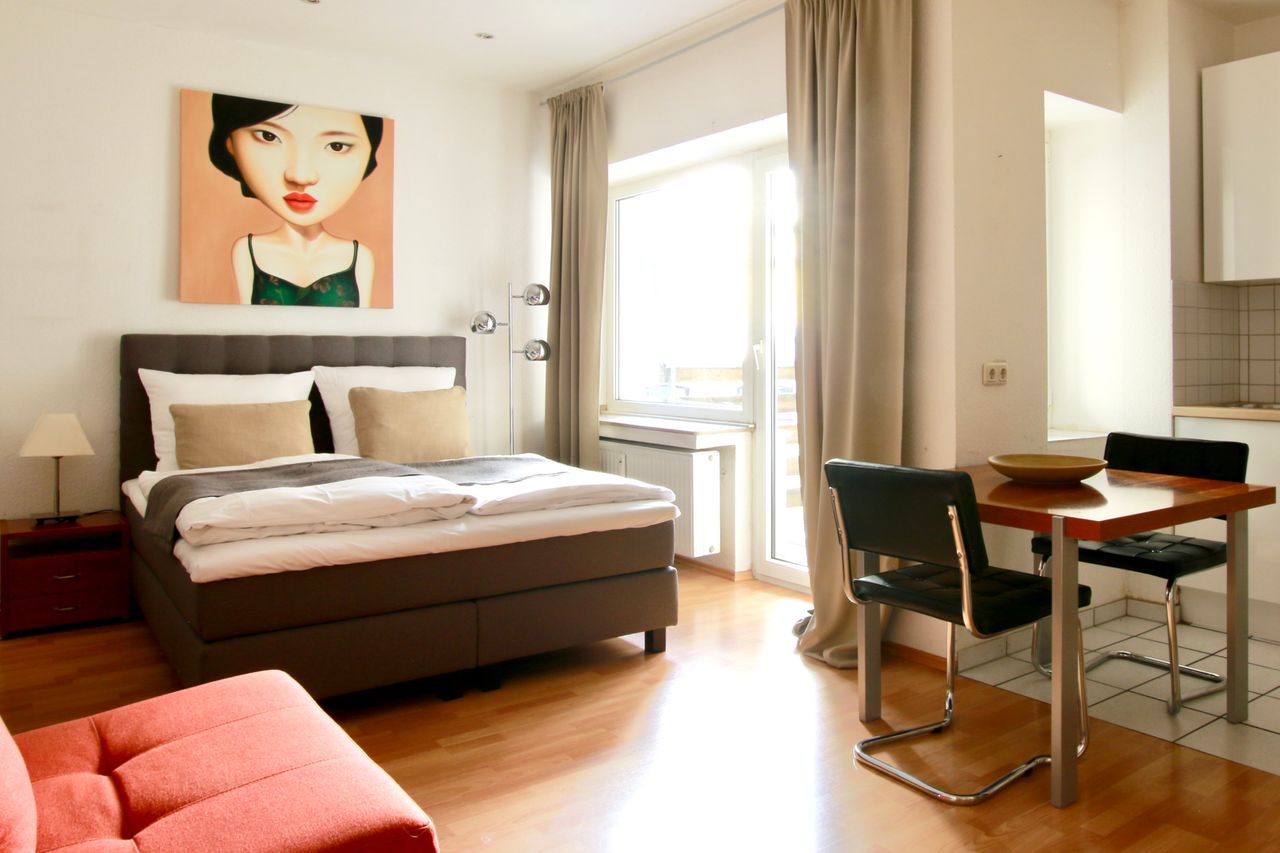 30 sqm apartment with balcony on the 1st floor of a 6-story apartment building opposite the beautiful Rathenauplatz in Cologne's lively student district. Open-plan living space with laminate flooring features a box spring bed (160 cm width), wardrobe, iron & ironing board, sofa, armchair, and TV. The fully equipped kitchen with dining table has a refrigerator, stove, microwave, kettle, and coffee maker. The daylight bathroom comes with a shower, washing machine and hairdryer. Free Wi-Fi is avai...