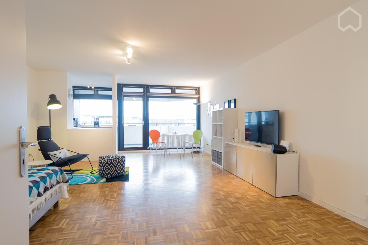 The very wide and big windows are letting a lot of sun into the room, making it a very bright apartment. Right beside the bed a black designer lamp is giving you a comfortable feeling at night when you are watching TV or just let the evening slip pass on the cozy armchair. The kitchen is extremely modern and got everything your heart desires, a new induction stove or a big oven for different kinds of settings. If you are a morning person you can greet the sun on your living room table right in f...