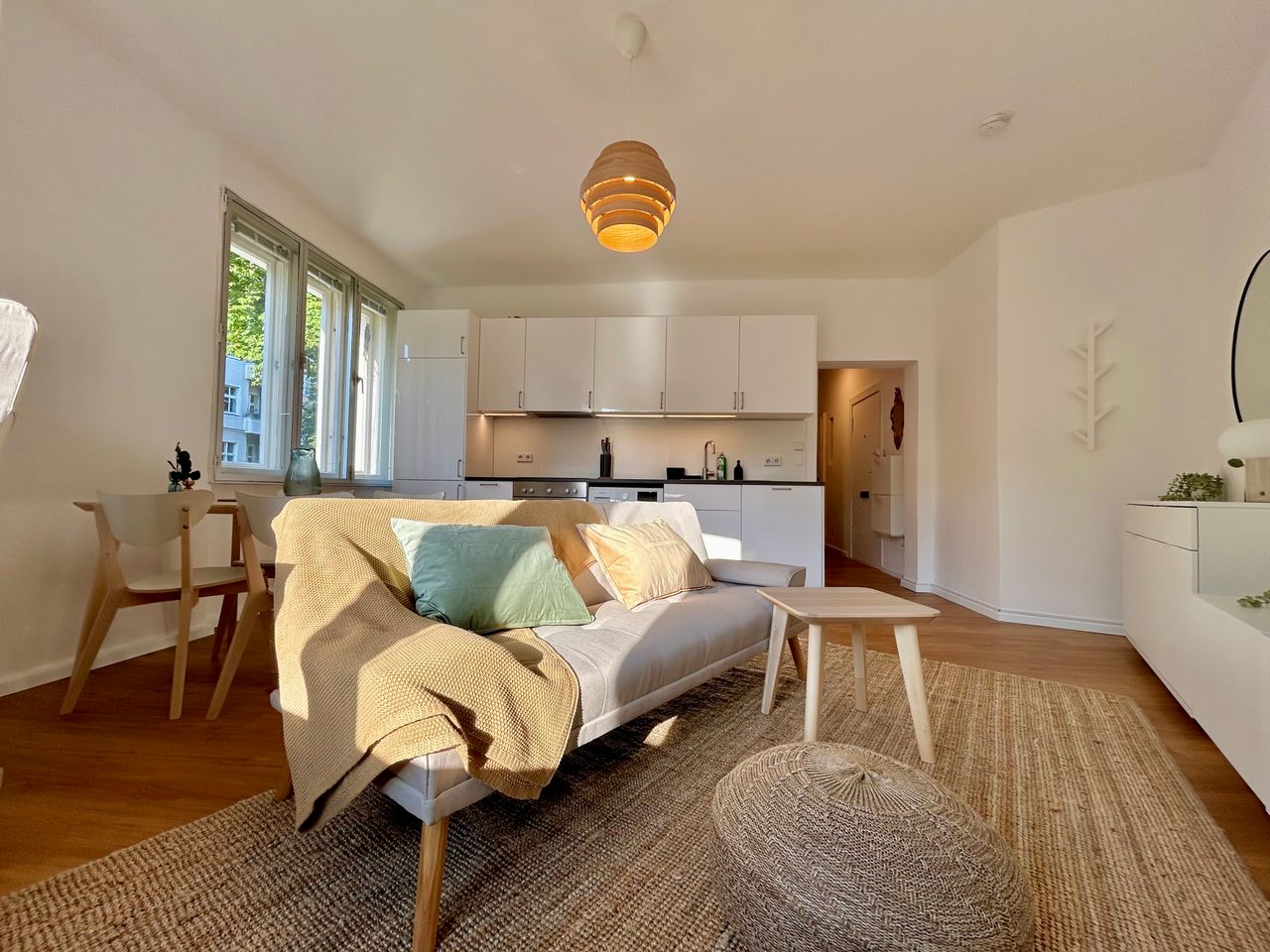 Welcome to your new home! This beautifully furnished 1-bedroom apartment located at Stubenrauchstraße, Berlin Friedenau, offers lots of sun, all needed amenities to work and chill, and one of Berlins best neighborhoods. Interior Features: Spacious Living Area: The open-plan living room is bathed in natural light, thanks to the large windows that offer a pleasant view of the neighborhood. The space is tastefully decorated with contemporary furniture, including a comfortable sofa, a stylish coffe...