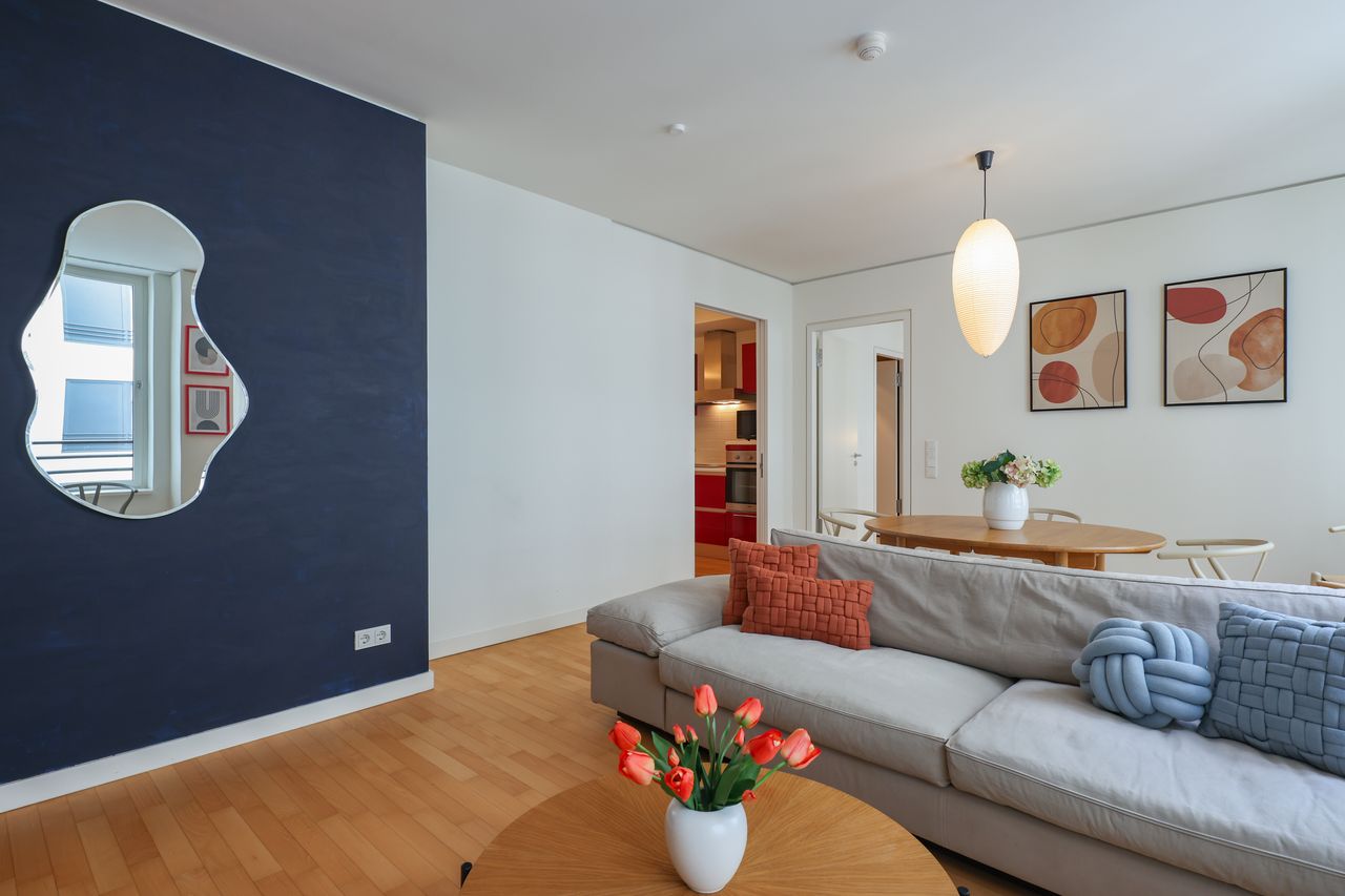 This perfect business apartment in the heart of Berlin leaves nothing to be desired. The spacious living and dining room is equipped with a comfortable couch, wall unit, flat-screen TV and an adjacent dining area with an extendable dining table for 6 people. The fully equipped kitchen also has a washing machine and dryer. The bedroom with a 2 x 2 m bed, bedside tables and a spacious wardrobe can be darkened. En suite is the bathroom with 2 vanities, bathtub and separate shower. The entire apartm...