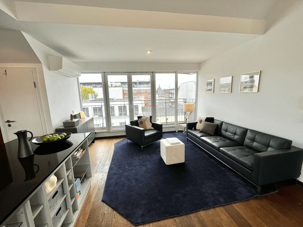 Beautiful top floor apartment with about 105m2 in a quiet street near Nordbahnhof - in a neighborhood with many trendy cafes, stores and restaurants. The apartment is spread over two levels: On the 1st level (4th floor) there are two bedrooms, each with a separate bathroom (one of them with bathtub), a toilet, as well as anteroom and closet space. One bedroom has a small balcony facing the inner courtyard. On the 2nd level (5th floor) is the living and dining area, as well as two terraces and ...