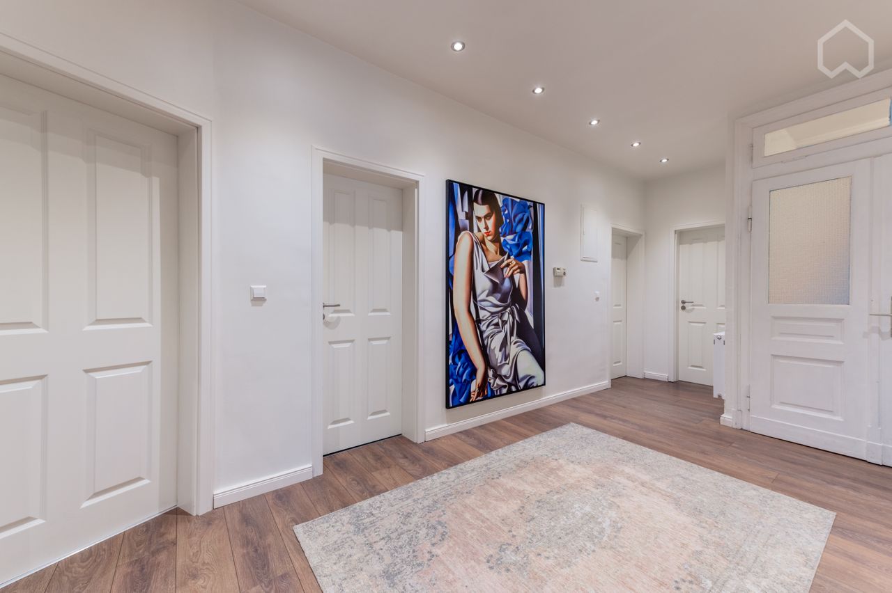 *English* This exclusive apartment has about 100 square meters and has a large entrance area from which all rooms lead off. In the living room there are two sofas and a television. Furthermore it convin8ces by 3 large window fronts. There are 2 bedrooms with a total of 4 beds for 5 persons. In the first bedroom there is a double bed, in the other 3 single beds. The bathroom is a shower room without windows, where there is also a washing machine. The kitchen is a fitted kitchen with a large refri...