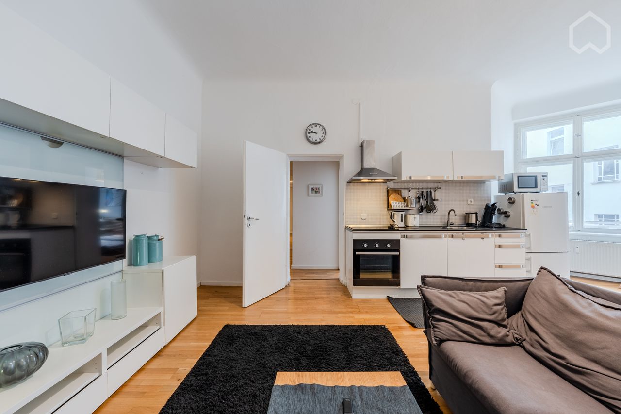 This bright and fully furnished two-bedroom apartment is located in a well-maintained Altbau building in the vibrant Prenzlauer Berg district, just steps from Schönhauser Allee. The apartment offers 65 square meters of thoughtfully arranged living space with a layout that emphasizes both comfort and functionality. Upon entering, you step into a long hallway that connects all the rooms. On the left side of the entrance, the first bedroom features a wardrobe and provides a cozy, private space. The...