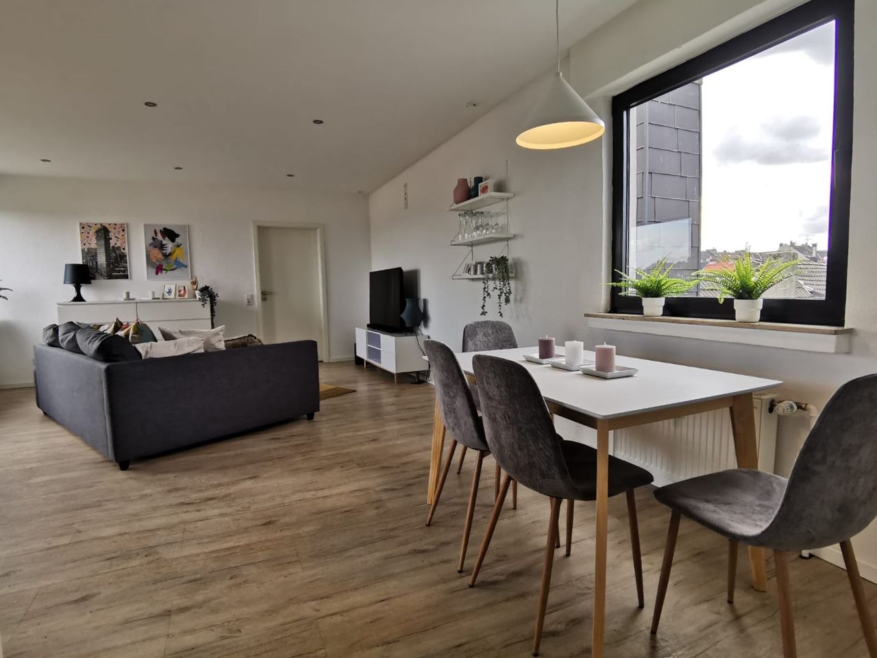 Welcome to your completely renovated penthouse apartment in Dortmund - Mitte (North). Below you will find all the important details about the apartment, surroundings and infrastructure. Basic information about the apartment: - Refurbished penthouse 2-room apartment 82sqm with 270 ° balcony - view over Dortmund - Modern apartment with high quality kitchen and upscale bathroom / toilet - Electric blinds in all rooms and windows - 1 box spring - double bed and 1 long sleeper - sofa bed are avail...