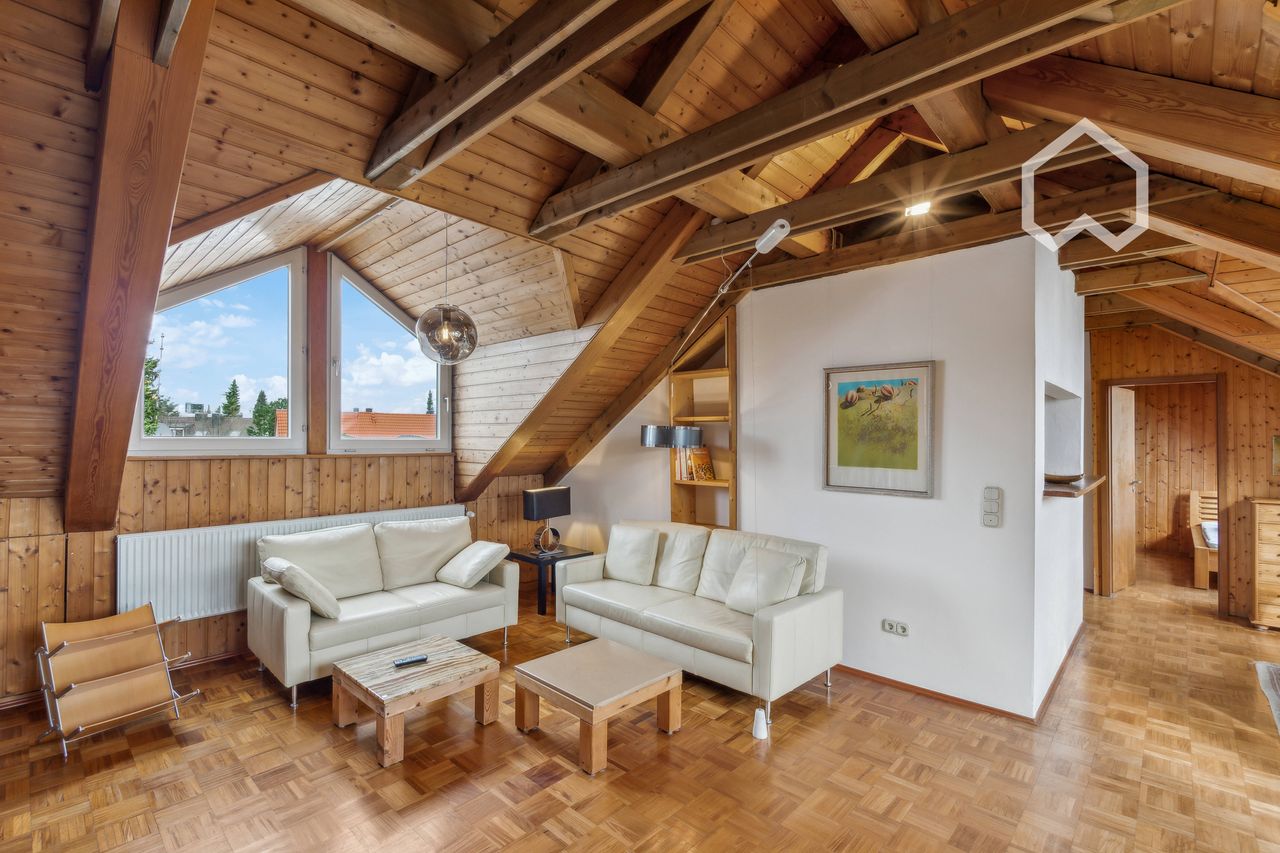 Approx. 60 square metres, partly antiques, partly designer furniture. Living room: large English desk, USM Haller shelving, leather seating area, TV and Blue-Ray DVD player, stereo system, ERCO light tracks, dining area with serving hatch to the kitchen, espresso machine. The living room has few sloping ceilings and a ceiling height of up to 4.5 metres. Kitchen: cooker, oven, extractor fan, kettle, fully equipped with crockery, cookware and cutlery, ceiling height 4.5 metres. Bedroom: double bed...