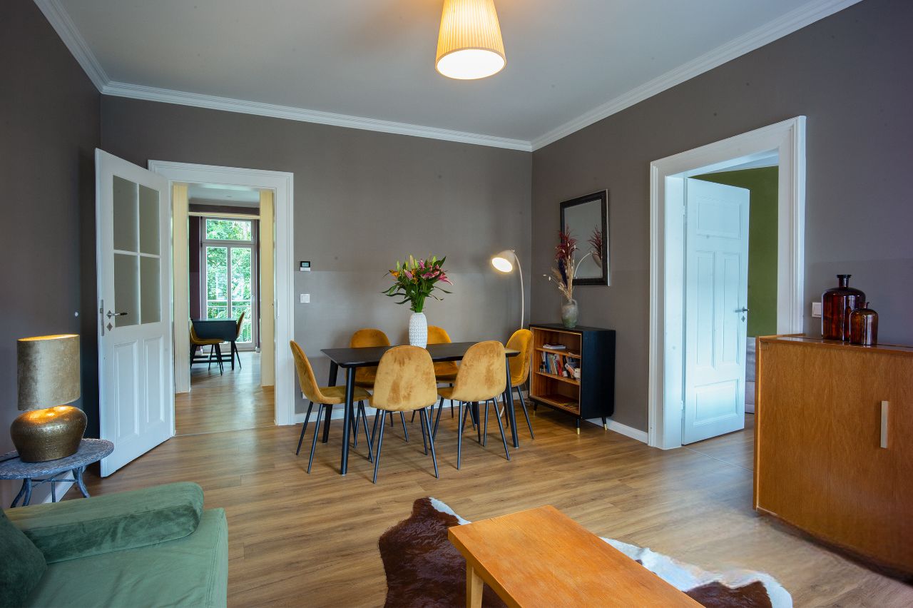 4-room suite at Lindenauer Markt. Perfect for families with children. Bedroom 1 (1 x single bed) Bedroom 2 (1 x bunk bed for 2 persons) Bedroom 3 (1 x double bed for 2 persons) Bedroom 4 (1 x double bed) Double beds (box springs) can be separated. High-speed WiFi TV entertainment Bathroom: 1 bathtub, 1 walk-in rain shower, 2 sinks, 1 toilet Kitchen (fully equipped) with balcony facing the courtyard Scene district Plagwitz. Tram 6 stops from the central station -Guest tax mandatory Please note: ...