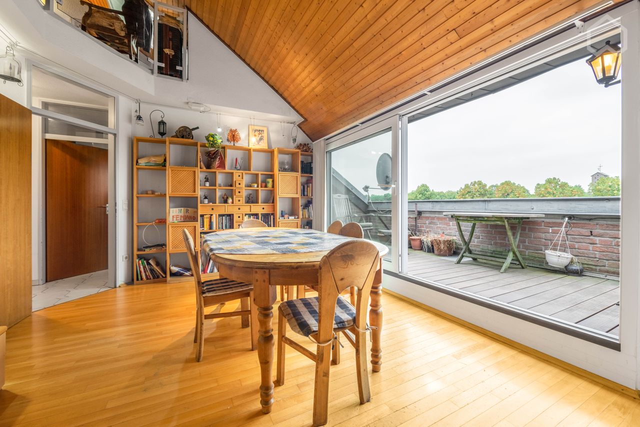 The beautiful maisonette apartment in Cologne's best location leaves nothing to be desired: 2 floors in open construction with a ceiling height of up to 4 meters! Floor space over 100sqm - Fully equipped kitchen - Real wood furniture - parquet flooring - Satellite reception - Panorama balcony with view over Lindenthal - Dining area with table & chairs - Living area with sitting area, DVD and panoramic smart TV On the 2nd floor: - Working area with highspeed fiber-optic WiFi - sleeping area wi...