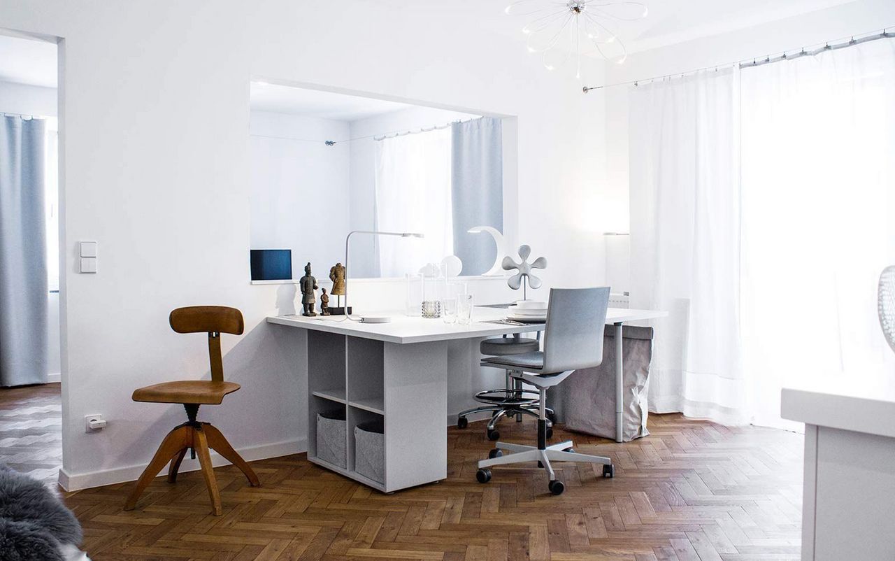 The two rooms of the bright apartment are distributed on 55sqm and are equipped with oak herringbone parquet. The entire building is lavishly refurbished and lovingly designed. living room Seat reclining cushion with pouf in silver metallic Foldable Scandinavian design wooden lounge chair Comfortable armchair Generous dining table in light gray Design chairs by VITRA Fitted kitchen fully equipped bedroom Ergonomic double bed (180 × 200) Self-designed wardrobe, shadow pattern lamp Drawer cabi...