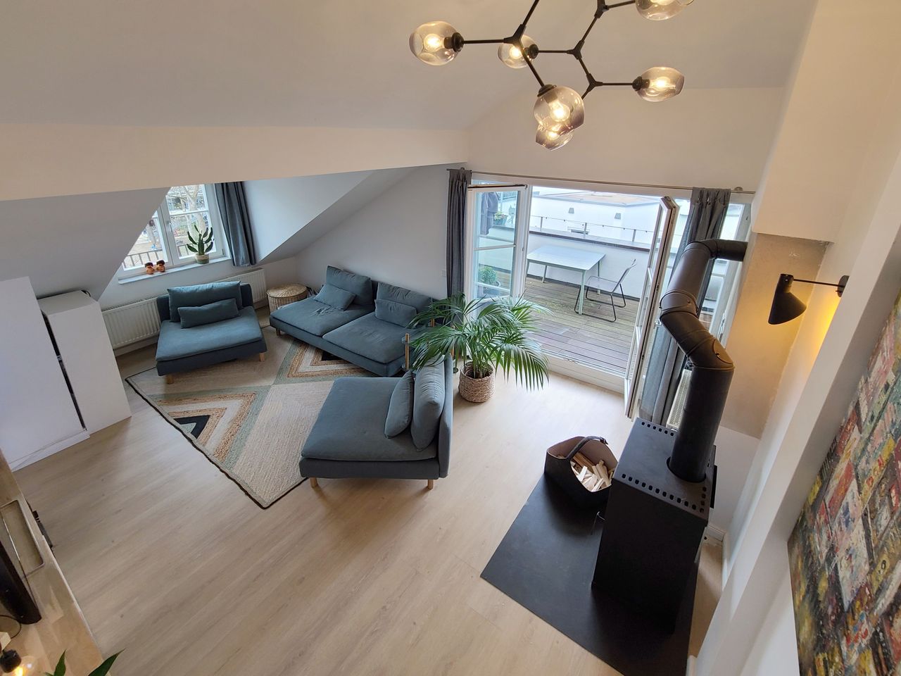 Unique top floor apartment over two levels with 12sqm terrace in award-winning old building in the heart of Schwabing. Super quiet with views over the rooftops of Munich. - Living-cooking-dining area: approx. 30sqm - Living room (5 meters ceiling height, fireplace stove as well as access to the terrace): Approx. 25sqm - Bedroom on the 5th floor approx. 25sqm (accessible via spiral staircase) - Bathroom with shower and bathtub - roof terrace with outdoor seating and dining table This apartment ...
