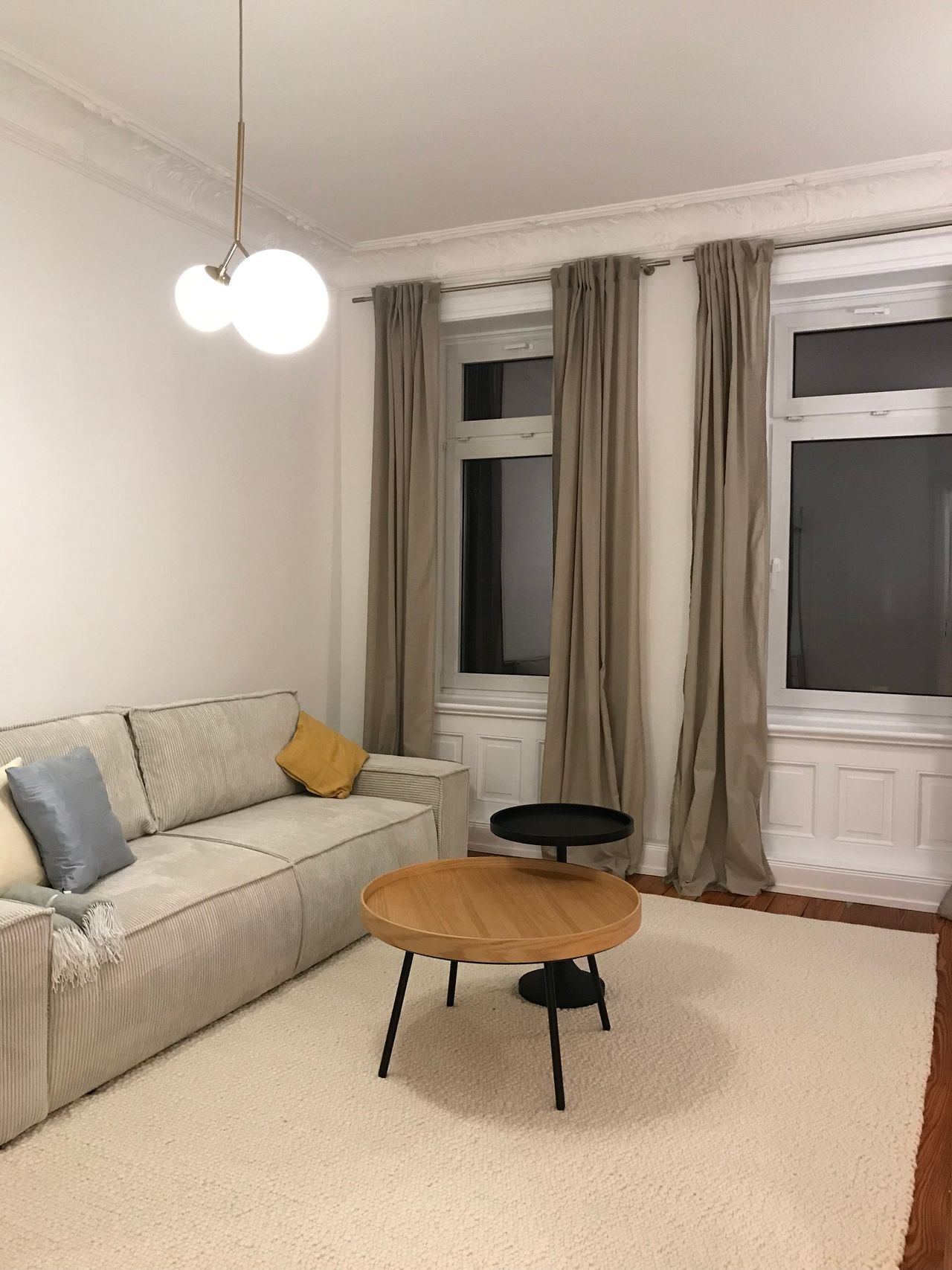 High-quality old building apartment in Eimsbüttel. High ceilings with stucco decorations form a great contrast to the minimalist and modern furniture. Directly adjacent to the living room you will find a bright dining room with a large table and four seats, here you can also access the balcony. The kitchen is modernly furnished and offers everything to prepare both a quick breakfast and a dinner menu for guests. The bedroom has a large double bed with a closet that provides plenty of space for y...