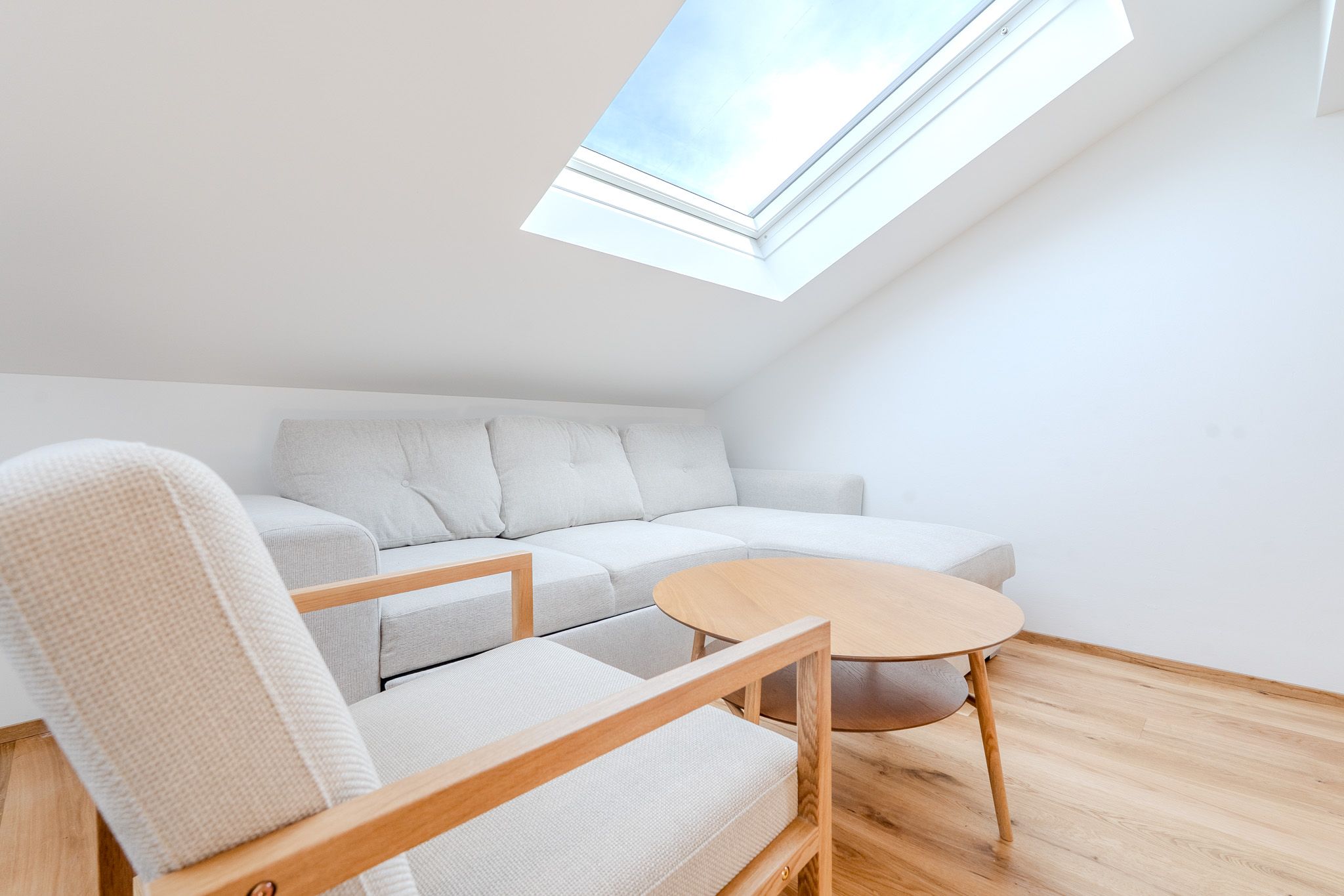 Quiet, centrally located attic flat with oak flooring, furnished, spacious floor plan