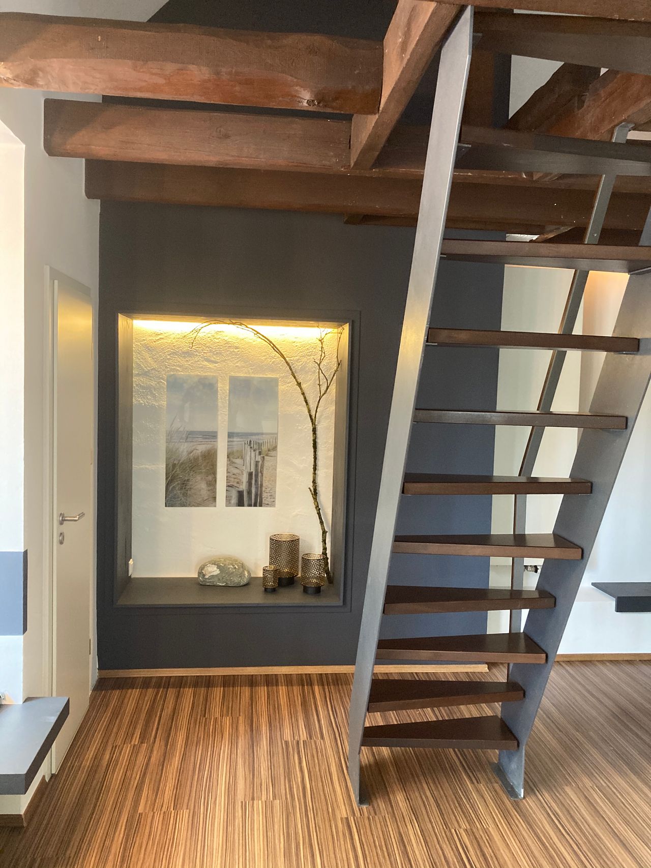 A bright, beautifully designed loft on the attic of an apartment block, featuring a multifunctional mezzanine level and a bathroom with natural light.
