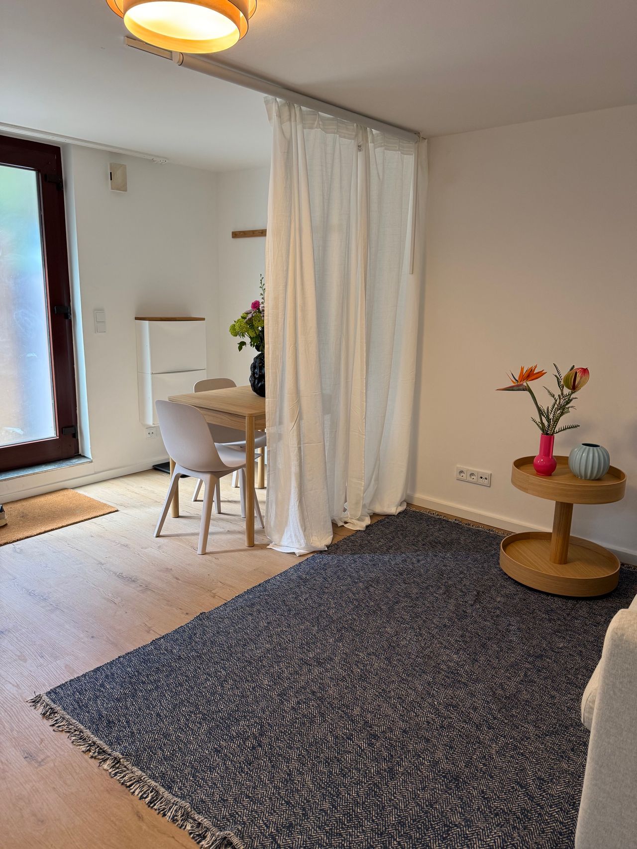 This stylish and well-designed 2-room apartment offers a comfortable and modern living environment in Cologne. The open-plan living area combines a fully equipped kitchen, dining space, and a cozy living room. The sofa can be converted into a comfortable sofa bed (140 x 200 cm) with a high-quality mattress, allowing accommodation for up to 4 people in total. The separate bedroom features a comfortable bed (160 x 200 cm), a spacious wardrobe, and a dedicated workspace, making it ideal for remot...