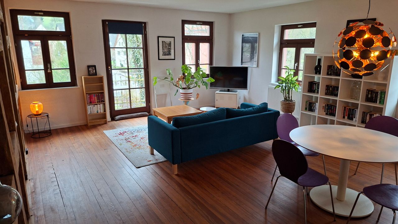 This bright and stylishly furnished 70 m² apartment is located in the quiet village of Moosbronn near Gaggenau, in the beautiful Northern Black Forest. The apartment combines modern comfort with the charm of a historic building and offers a spacious and relaxing living environment – ideal for professionals, project workers, or anyone looking for a comfortable temporary home. The large living room with its beautiful wooden floors and historic timber elements creates a warm and inviting atmospher...