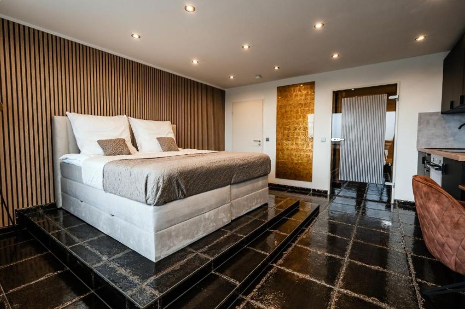 Das Apartment ist als offenes Studio konzipiert und verbindet Schlafen, Wohnen und Kochen auf elegante Weise. Durch das durchdachte Design wirkt der Raum großzügig und modern zugleich. Die Kombination aus dunklen Böden, warmen Holzelementen und indirekter Beleuchtung sorgt für ein exklusives Ambiente und einen Golden Stay.