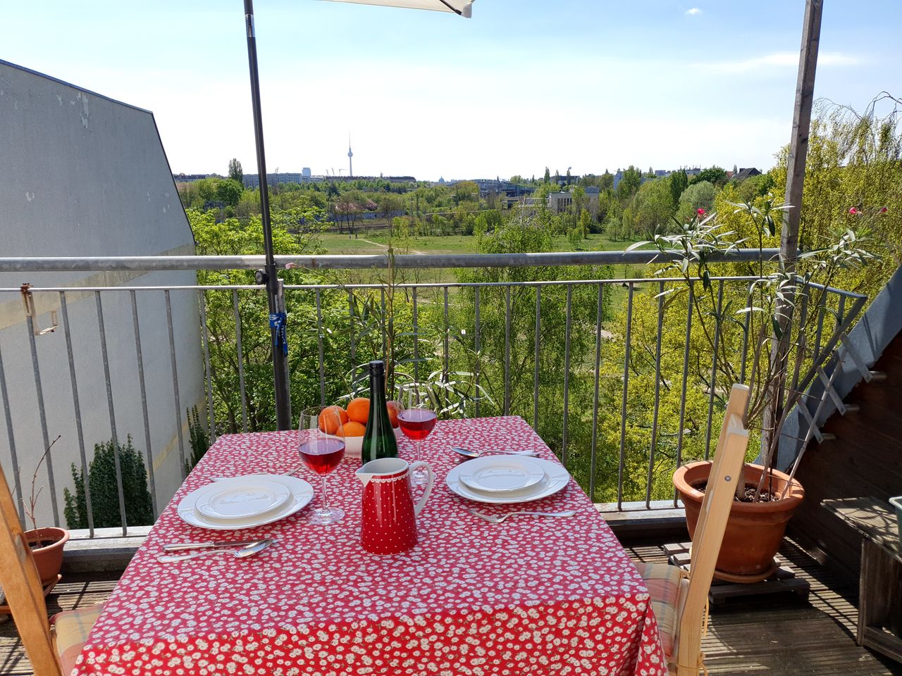 Beautifull spatious appartment with a big sunny terrace and unrestricted view over the own garden, the park and Berlin Center. Perfect first home for: 1) a couple with kids or need for a separate office/guestroom 2) or 2 co-habitants each having its own private bedroom and bathroom, before finding a permanent residence. The spatious roof-top appartment has 3 sleeping rooms, 2 bathrooms, a supplementary open living room and a spatious kitchen area opening towards the big terrace with beautiful...