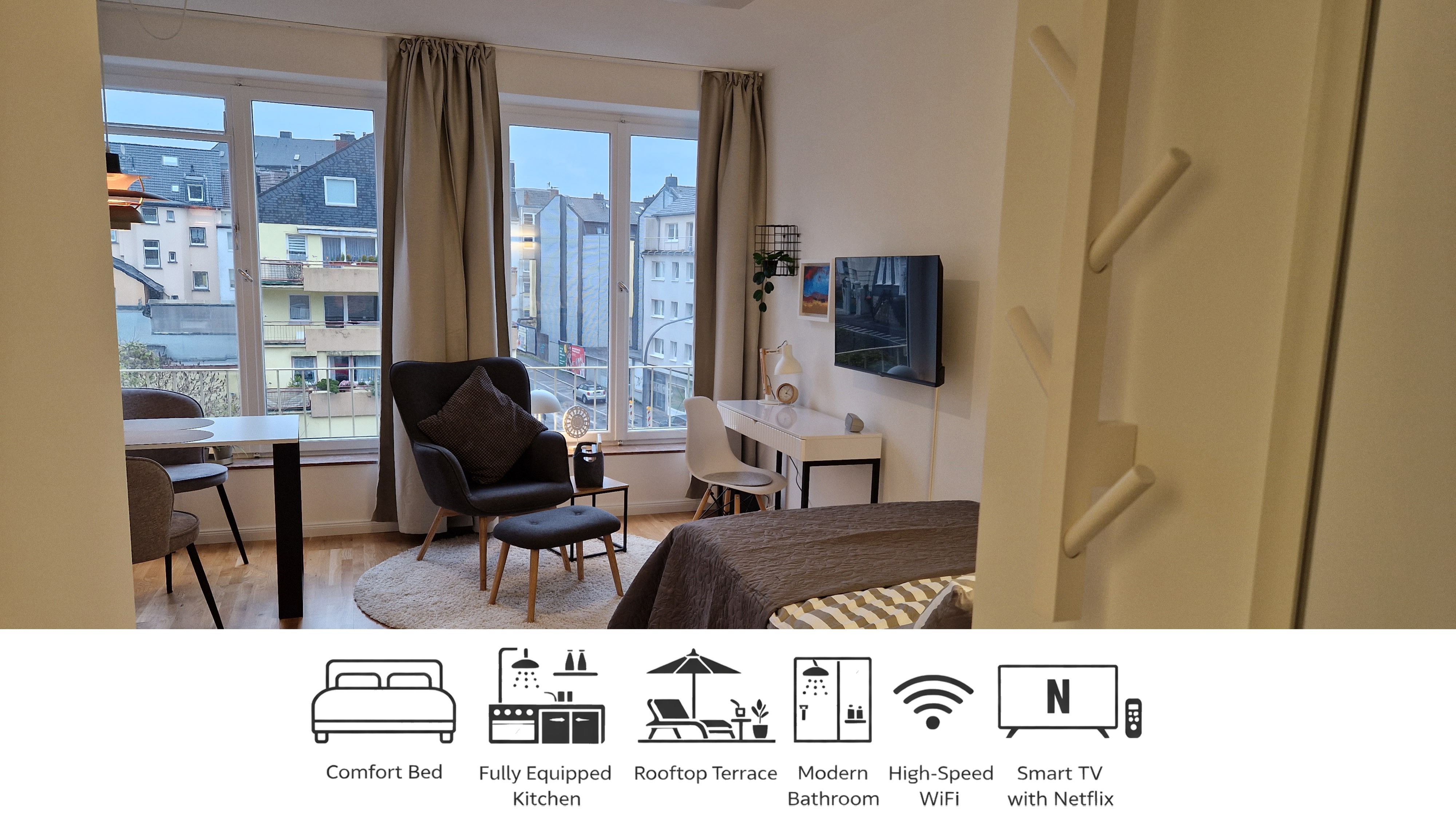 New designer apartment, centrally located near city hall, parking spaces, shared roof terrace, Netflix