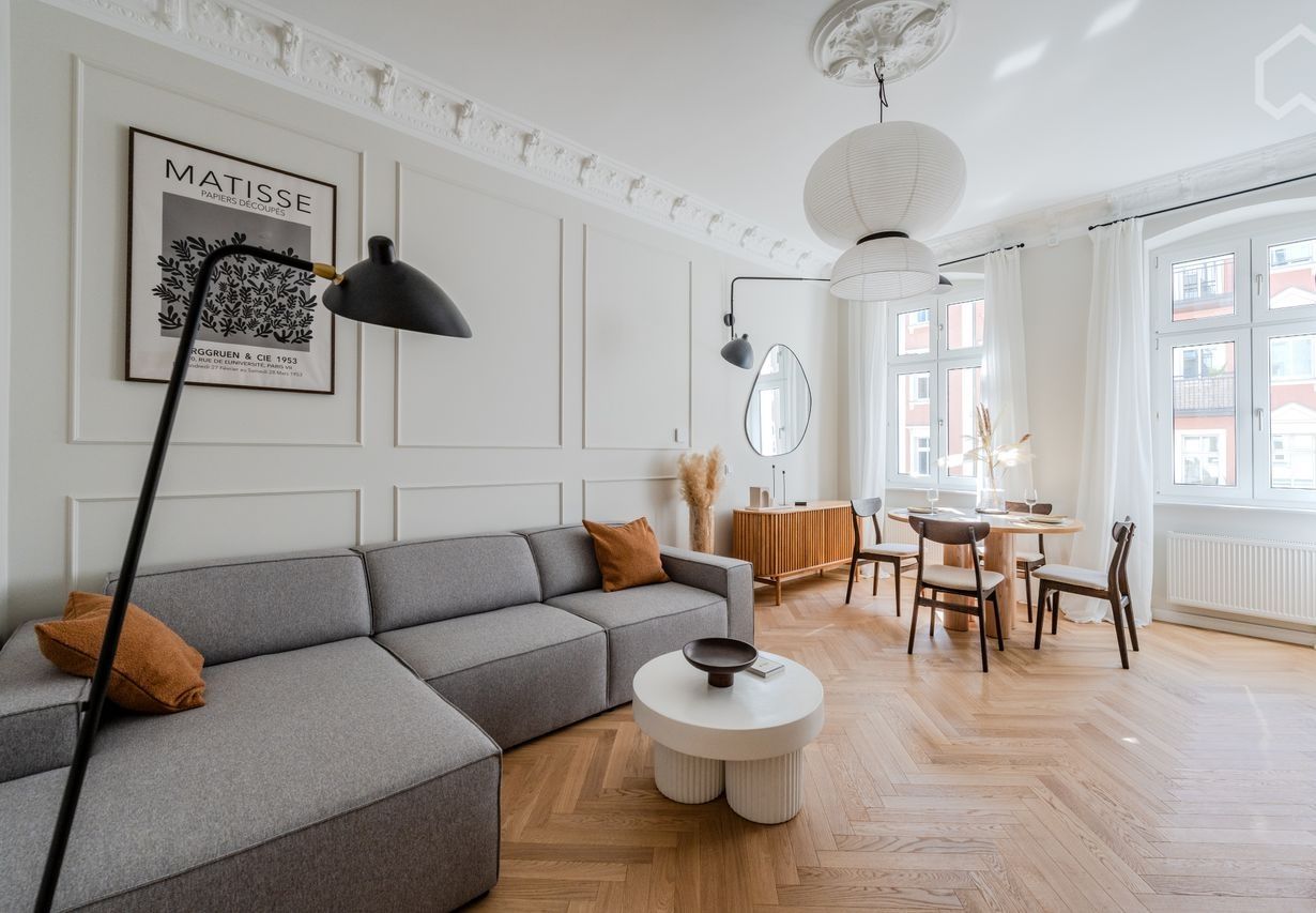 **Fully renovated in 2024** This charming boutique apartment is located in a quiet side street, nestled between the trendy districts of Mitte and Prenzlauer Berg, just a few steps away from the popular Mauerpark. Situated on the 2nd floor of an historic building, the 1-bedroom apartment has recently been completely modernized and tastefully furnished by an interior designer. Covering a total space of 50m2, it features a large living room with a custom-designed kitchen, a stylish bathroom an...