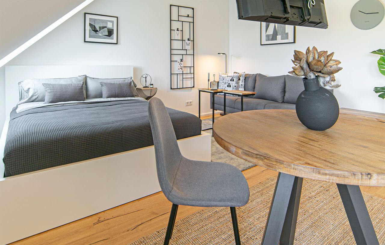 The offered apartment is located in an apartment building. The stylishly furnished apartment has a modern bedroom / living room, a kitchenette and a well-equipped bathroom. All rooms are fully equipped and offer everything for everyday use. The kitchenette has cooking utensils, a microwave, ceramic hob, a coffee machine and a dining area. The living / sleeping area has a 140 bed and sofa bed. Modern home accessories give every room a special feel-good character.