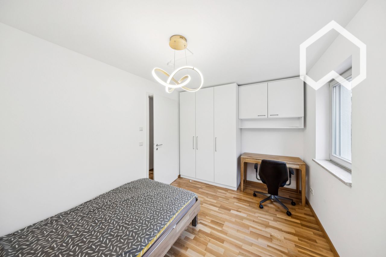 A furnished room is available for rent in a high-quality, fully furnished apartment. The apartment is located in a quiet yet well-connected area and is ideal for professionals or students who value comfort, style, and privacy. The common areas and all rooms are fully furnished and tastefully decorated. The available room number 1 measures approximately 11 m² and faces north. Here, too, large windows ensure a bright, friendly atmosphere. The room is equipped with a 1.20 m wide bed, a 1.5 m wide...