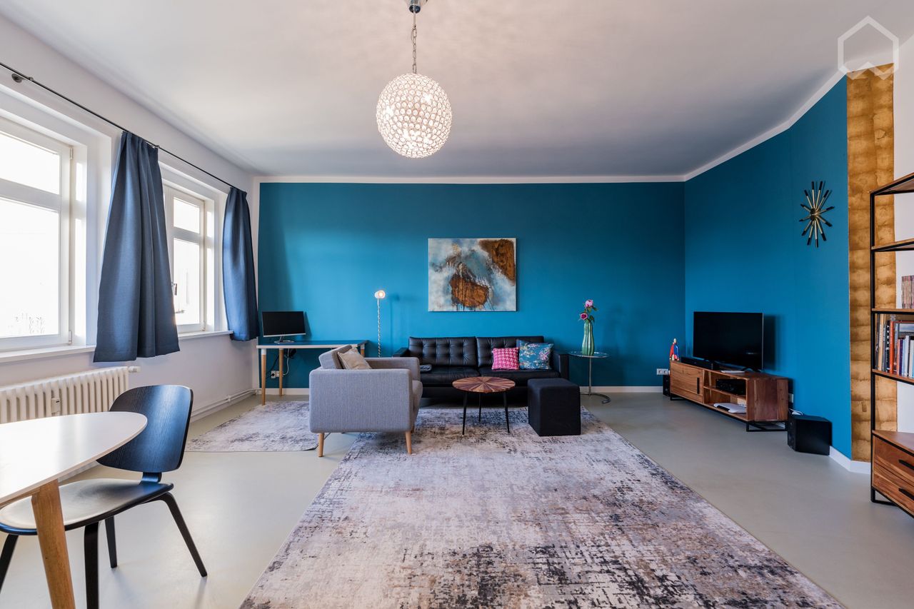 Managed by Wunderflats: This stunning residence offers a rare combination of high-end design and total functionality in one of Berlin’s most iconic locations. The interior has been meticulously curated to balance a sharp, industrial aesthetic with warm, inviting living spaces. The heart of the home is an expansive, open-plan living and dining area featuring bold teal accent walls and sleek, concrete-style flooring. Large, classic windows frame panoramic views of the symmetry and fountains of St...