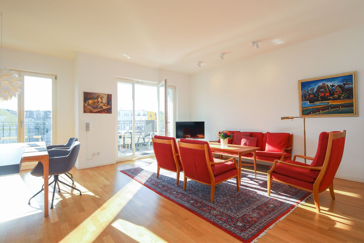 Bright and comfortable 3 room new apartment with south - west loggia, separate west facing balcony and 2 bathrooms. The furniture is a good mix of classic, retro and modern. The living area includes a 3-seater couch and 3 armchairs, coffee table, closet and flat screen TV. The large and cozy loggia is accessible from the living area. The dining room with extendable dining table for 8 people adjoins the open and fully equipped modern fitted kitchen, Master Bedroom with double bed (180x200), spac...