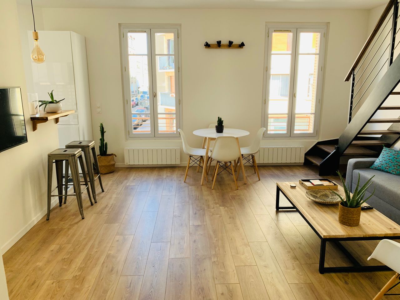 Situé dans une charmante petite copropriété, ce 2 pièces est composé de 2 niveaux. Niveau 1 - entrée, salon, débarras, salle de douche + toilette, cuisine américaine (tout équipée, plaques induction, lave vaisselle, lave linge, four, micro ondes, machine à café Nespresso...) et grand salon (avec télévision et canapé lit 140cm). Niveau 2 - chambre sous comble (avec lit double 160cm - matelas mi ferme) + dressing - possibilité d'un couchage enfant supplémentaire dans la chambre