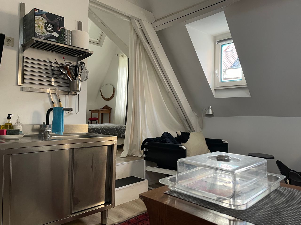 Niché sous les toits au 3ème et dernier étage, en plein centre de Bruxelles dans une belle maison ancienne, un studio tout équipé de 30 m2, beaux volumes, lumineux, climatisé, entièrement rénové par architecte. un lit 140x200 avec un matelas tout neuf et épais depuis le 14 novembre 2024). Partie nuit séparée. Des beaux meubles anciens et un véritable espace de réception.