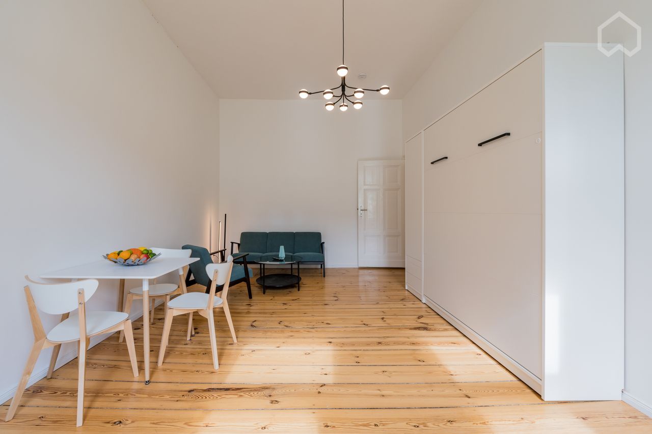 The beautiful old building apartment is located on the 4th floor of the sidewing building of a typical Berlin old building. The apartment has a separate bedroom and a very large living room as well as a modern bathroom with bathtub and a completely refurbished kitchen. The house is located between the subway station Mehringdamm and the subway station Gneisenaustr. (both about 500 m entfertnt) so there is connection to the subway lines: U6 and U7 as well as to the bus lines 140, 248, M19, N6, N...