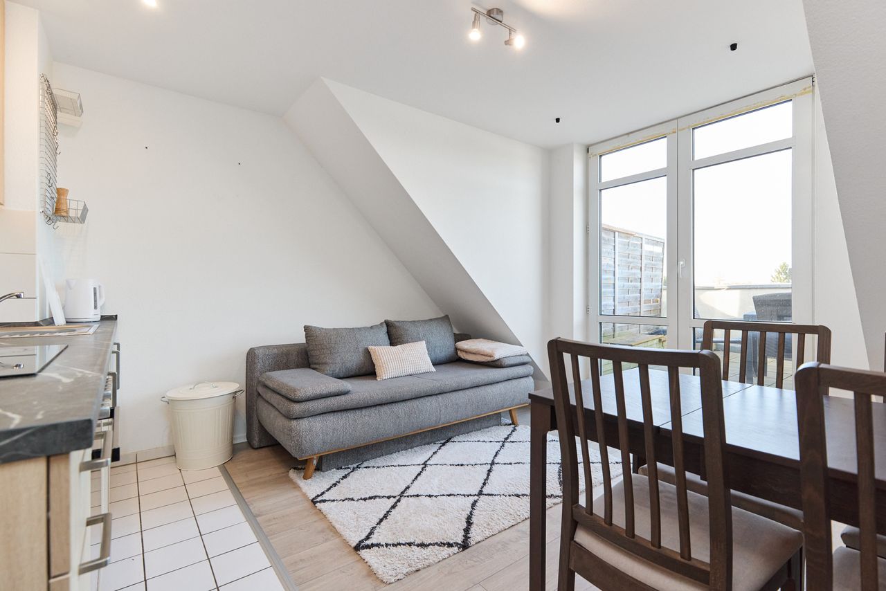 This modern apartment is located in the well-connected Aachen-Eilendorf district. The apartment is fully furnished and includes the items listed below. The 39 square meters comprise a living/dining room with a kitchen, a bathroom, a bedroom, and a large rooftop terrace. The apartment is suitable for a maximum of 3 people. Pets are not allowed. A private outdoor parking space is included in the rent.