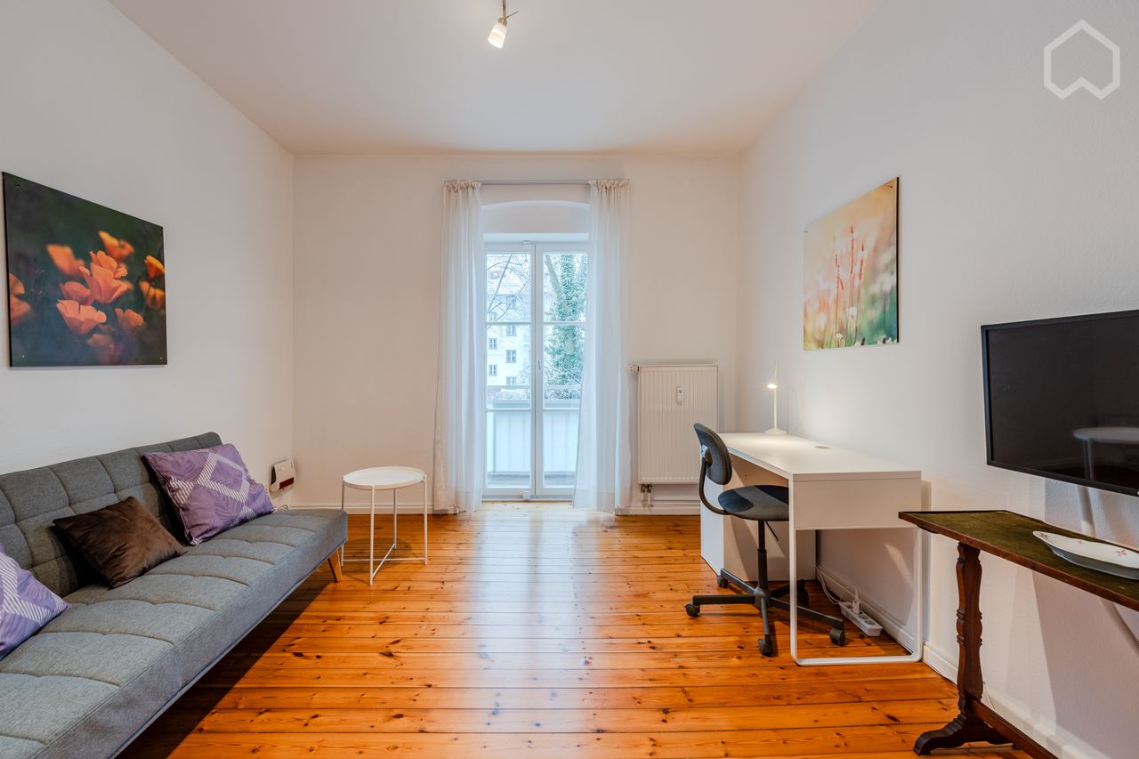 The perfect home in Berlin! Central and at the same time calm apartment with oak flooring. Within walking distance to S-Bahn Greifswalder Straße (Ring train) and Tram Greifswalder Straße/Danziger Straße. Fully furnished. You can move right in! The apartment has a balcony to the courtyard. The front side of the apartment with bedroom and bathroom looks onto Anton-Saefkow-Park. The bright bathroom with daylight was rebuilt a year ago barrier-free. Fully equipped kitchen. Living room with work desk...