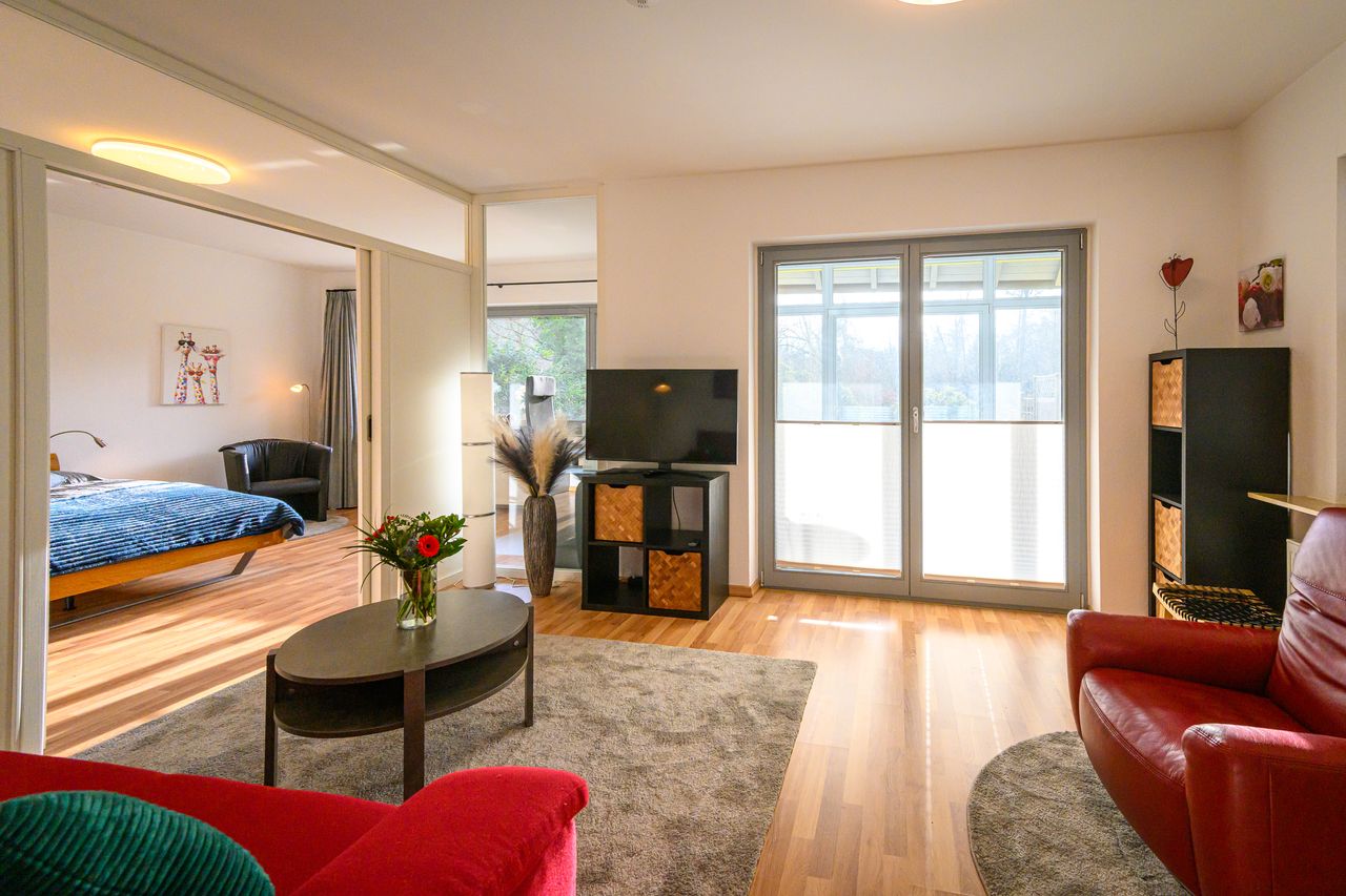The light-flooded apartment is located in the midst of greenery, in a quiet cul-de-sac. The apartment has a separate access and a private entrance. It is tastefully and completely newly furnished and equipped, including bed linen and towels. It features a hallway with a wardrobe, a shower room with a washer-dryer, a fully equipped kitchen, as well as a bedroom with a desk workspace and a living room. An attached winter garden and the large south-facing terrace invite you to relax. A covered stor...