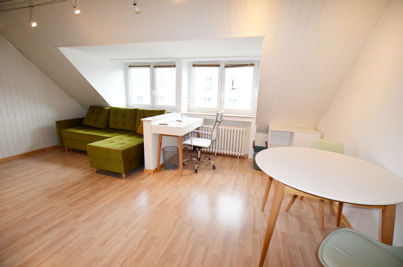 2 room layout Sleeping room equipped with a 1,40 m x 2,00 m bed and spacious closet Floor with mirror and storage bothroom with shower, van, and mirror closet Living room with cosy couch (sleeping function) 55 inch TV, Soundsystem, desk, dining table Fully equipped kitchen. 100m to the Rhine promenade, 2 min to the busstop and Tram Station Bertha-von-Suttner Platz, short disstance to city centre with cafes, restaurants and main train station. Non smokers only.