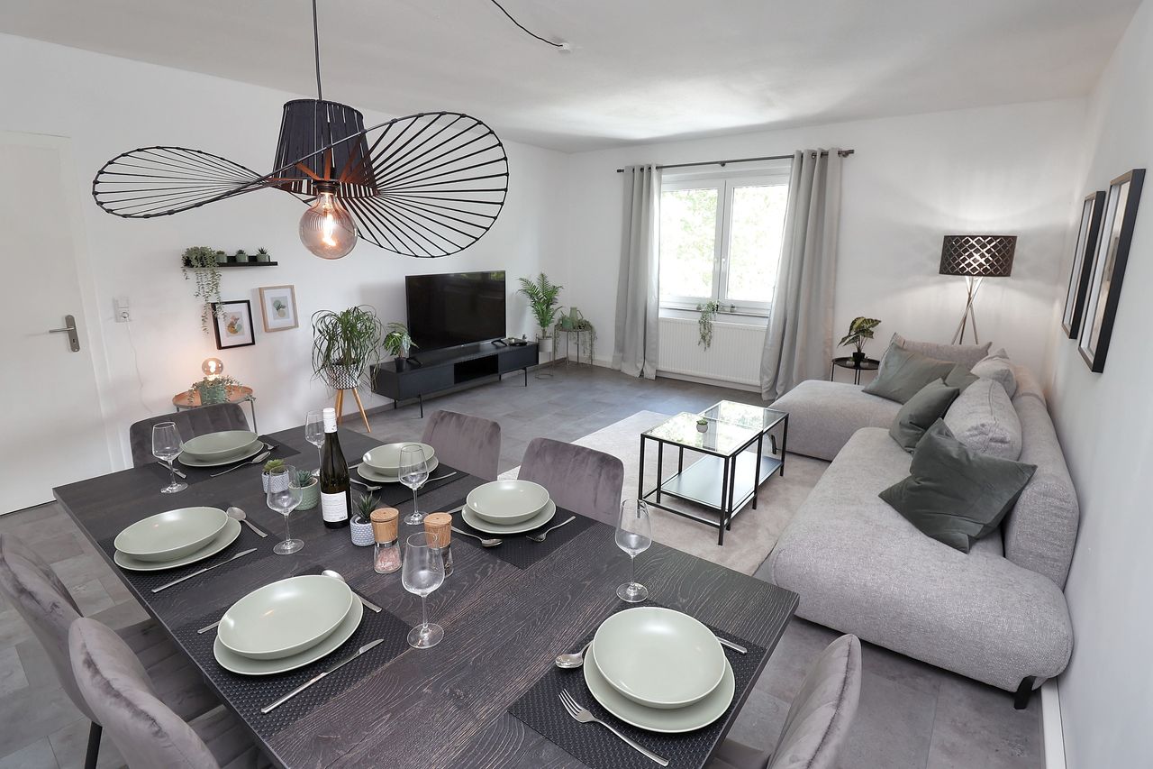 The 115 m² apartment on the 1st floor offers enough space for a group of 6 to feel at home. There are 3 bedrooms available, each of which has a king-size box-spring bed (1.80 m wide) in which you can sleep wonderfully and recharge your batteries for the next day. You can store your clothes in the open wardrobe module or in the walk-in closet. One room also has a desk with a lamp. You can relax on the comfortable couch in the living room or watch a movie after you have fortified yourself for or...