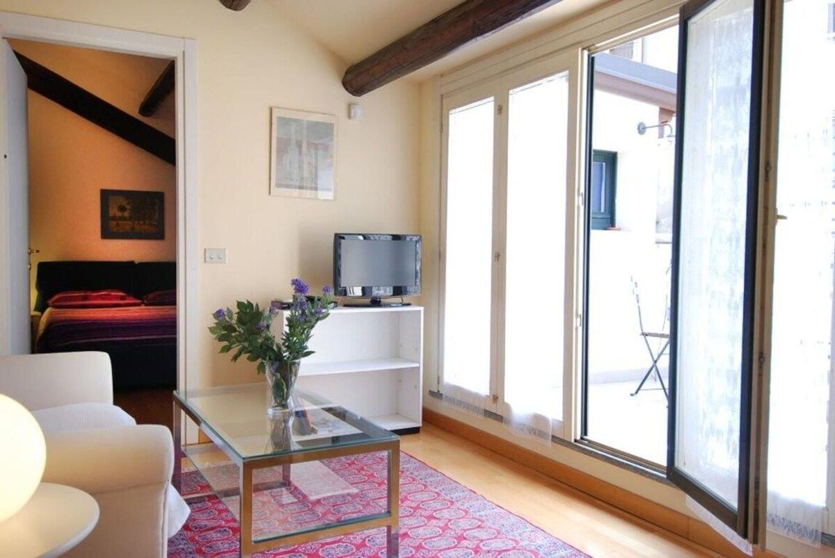 Bright one bedroom apartment for vacation rentals in Milan with terrace, located on the fourth floor of a stately building (with elevator until the third floor) in the historical center of Milan. This modern and bright 65 sq. mt apartment, fitted with parquet flooring and air conditioning in the living room, opens up onto a corridor with a small walk-in closet on the left, leading to the day area, furnished with a comfortable couch, a TV corner, a dining table for 2 people, a fully... The space ...