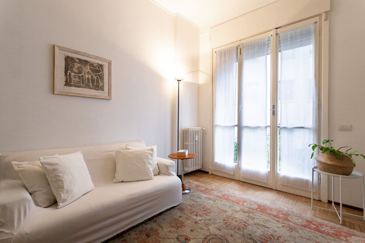 A short corridor with large wardrobes leads to the living area with open kitchen. We find a table for four people, a two-seater sofa, a large bookcase and a 42-inch smart TV. The window leads to the balcony with a pleasant view of the internal garden and a comfortable chair. The kitchen is complete and equipped with an induction hob, fridge, freezer, coffee machine, traditional oven, microwave and dishwasher. The first bedroom has a single bed, a two-door wardrobe, a desk with chair and... The s...