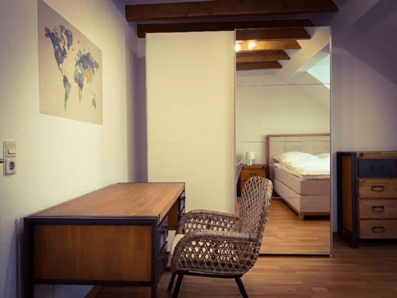 Please keep in mind that the 480€ cleaning fee + 480€ non-deposit fee have to be paid BEFORE moving in. This is an unlimited contract with 1 month notice. This is one of the 3 bedrooms in the apartment. YOUR ROOM: The room is equipped with a king-sized box-spring bed accompanied by fine bedding as well as two bedside tables, a chest of drawers, a working desk with a corresponding chair, and a large closet with a mirror. What really stands out is the private balcony, which offers a great view o...