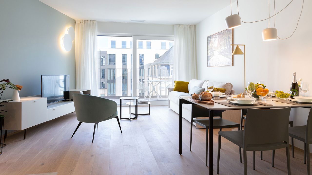 Cet appartement exécutif T2 (Type B) propose une configuration fluide et bien structurée, idéale pour les voyageurs recherchant à la fois confort et séparation des espaces. D’une superficie de 50 m², il convient parfaitement aux professionnels, couples ou petites familles séjournant à Luxembourg. Le séjour spacieux, équipé d’un canapé-lit, constitue un espace distinct dédié à la détente ou au télétravail. Lumineux, il s’ouvre sur une terrasse privée donnant sur une cour intérieure calme, prolon...