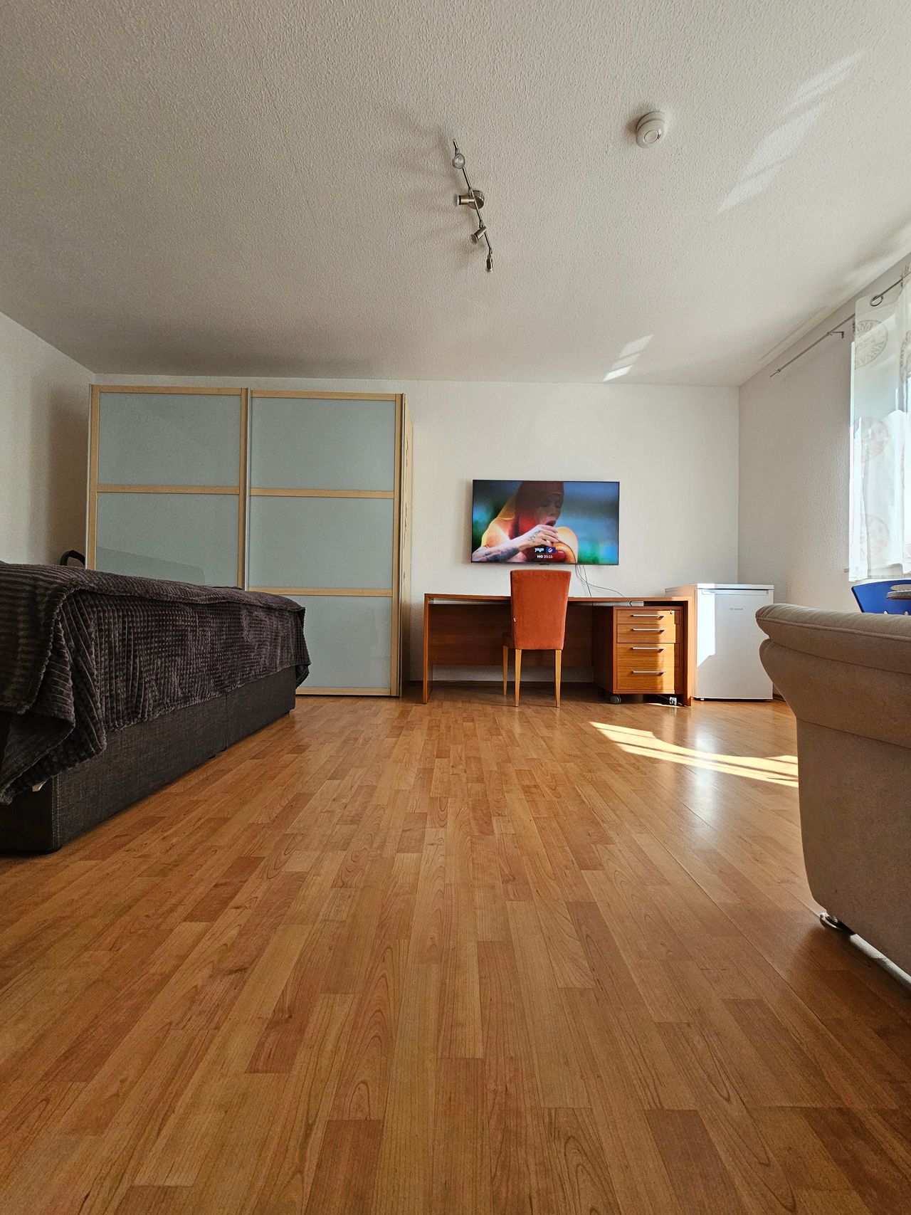 Welcome to our apartment! Enjoy a restful sleep in the 180x200 cm box spring bed. The apartment features a kitchen, refrigerator, a large desk, and a cozy workspace. A spacious wardrobe, a private bathroom with a shower and toilet, as well as fast Wi-Fi and a TV, ensure comfort. Additionally, tea, water, and coffee capsules for the Tchibo machine are provided. The quiet yet central location is ideal – a private garage is also available free of charge.